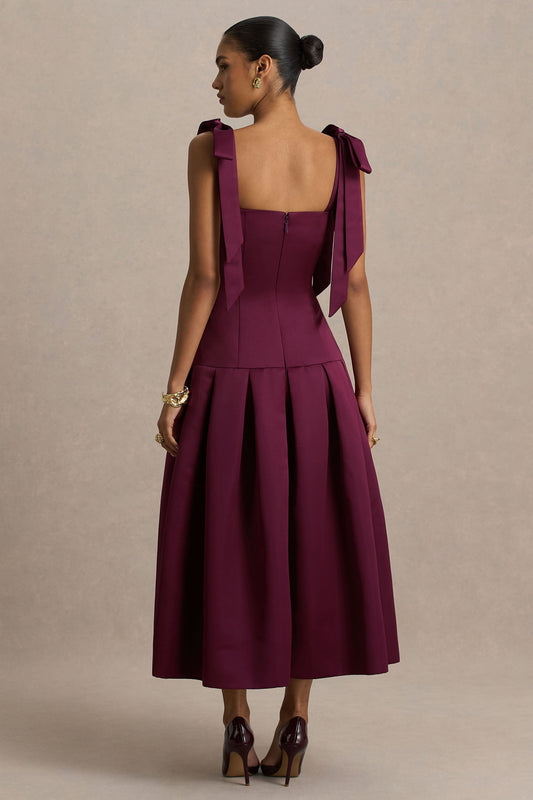 Alberta | Burgundy Satin Midi Dress With Bow Straps