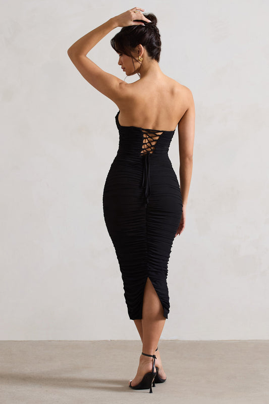 Nylah | Black Ruched Corset Bodycon Midi Dress