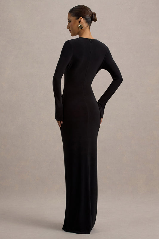 • Idony | Black Plunge-Neck Gathered Split Maxi Dress With Ring Detail