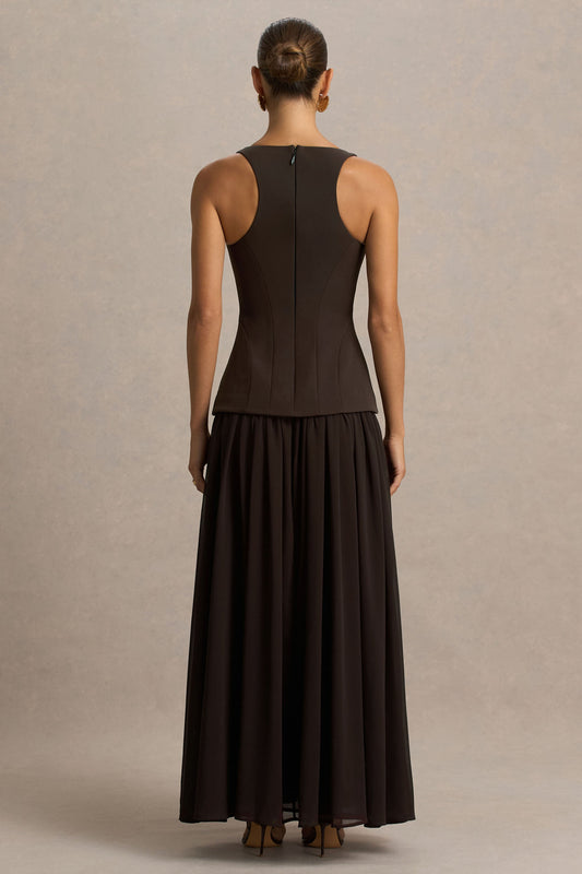 Kelly | Brown Scoop-Neck Maxi Dress With Mesh And Pleated Detailing