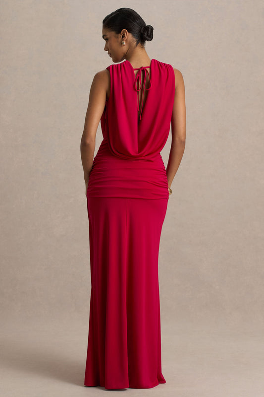Serafina | Red Extreme-Plunge Maxi Dress With Ruched Detailing And Open-Back