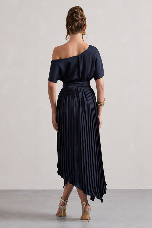 India | Navy Satin Asymmetric Plisse Maxi Dress