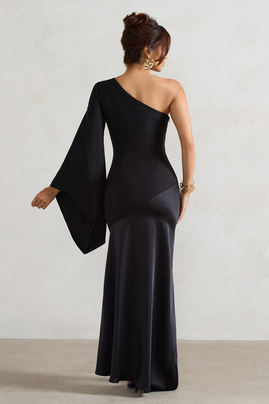 Salem | Black Asymmetric Cape-Sleeve Maxi Dress With Satin Skirt