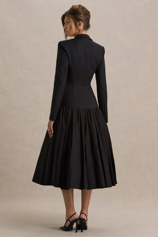 Cosmopolitan | Black Plunge-Neck Tailored Midi Dress With Pleated Hem