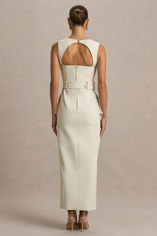 Pepita | Cream High-Neck Tailored Maxi Dress With Drop-Waist And Satin Skirt