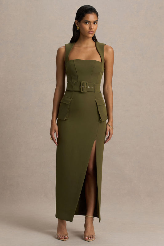Sandra | Olive Square-Neck Tailored Maxi Dress With Front-High Split