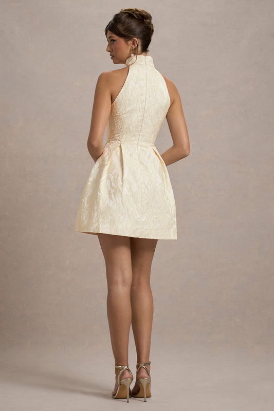 Costa | Ecru Jacquard High-Neck Mini Dress With Pleated Skirt