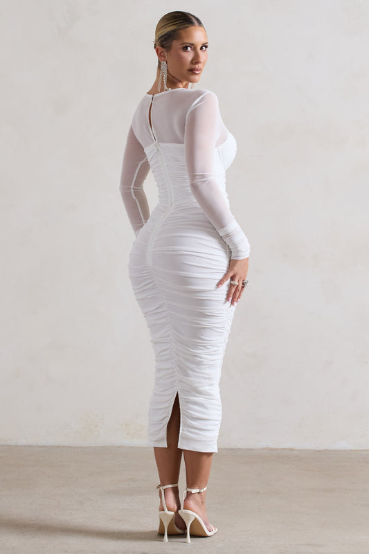 Seductress | White Long Sleeve Square Neck Ruched Midi Dress