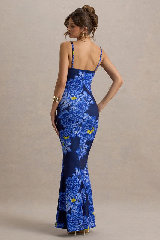 • Farah | Blue Floral Print Plunge Neck Maxi Dress With Split Detail