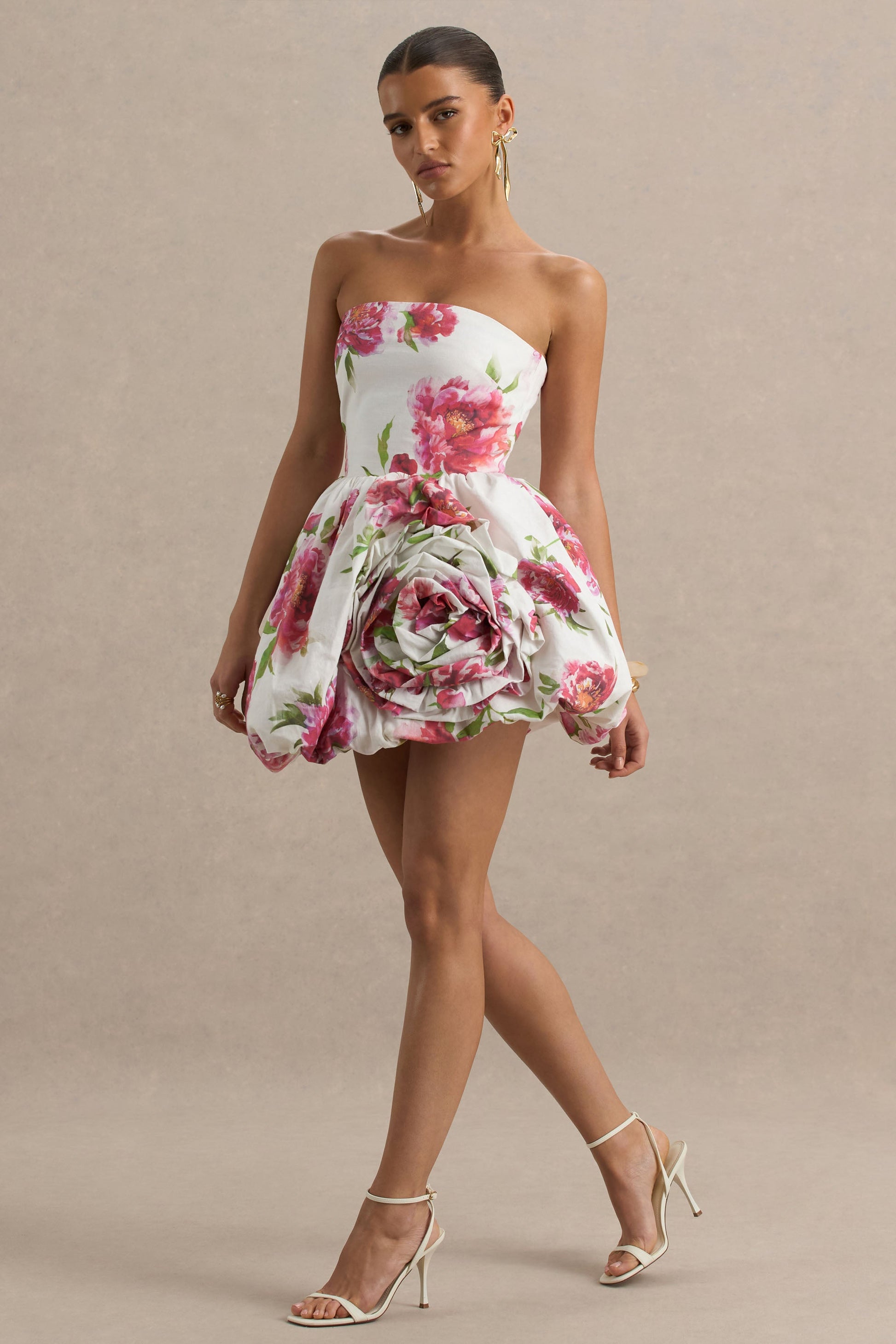 Adira | Cream Floral Print Bandeau Puffball Mini Dress With Ruffle Detail