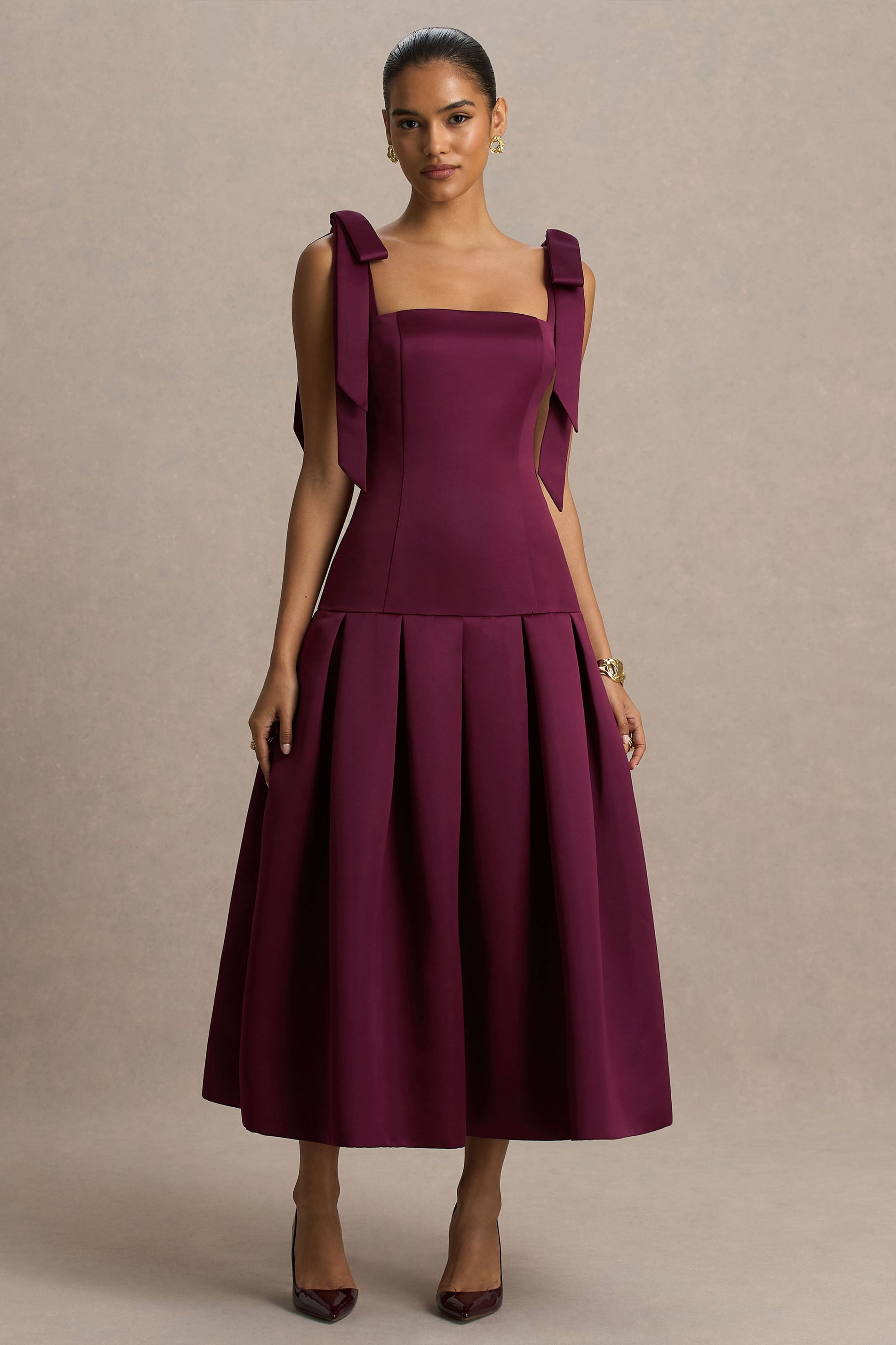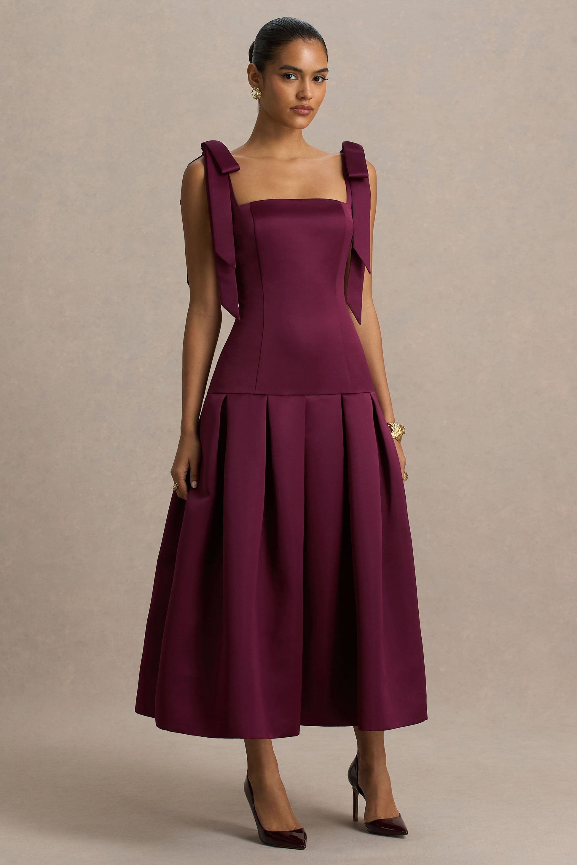 Alberta | Burgundy Satin Midi Dress With Bow Straps