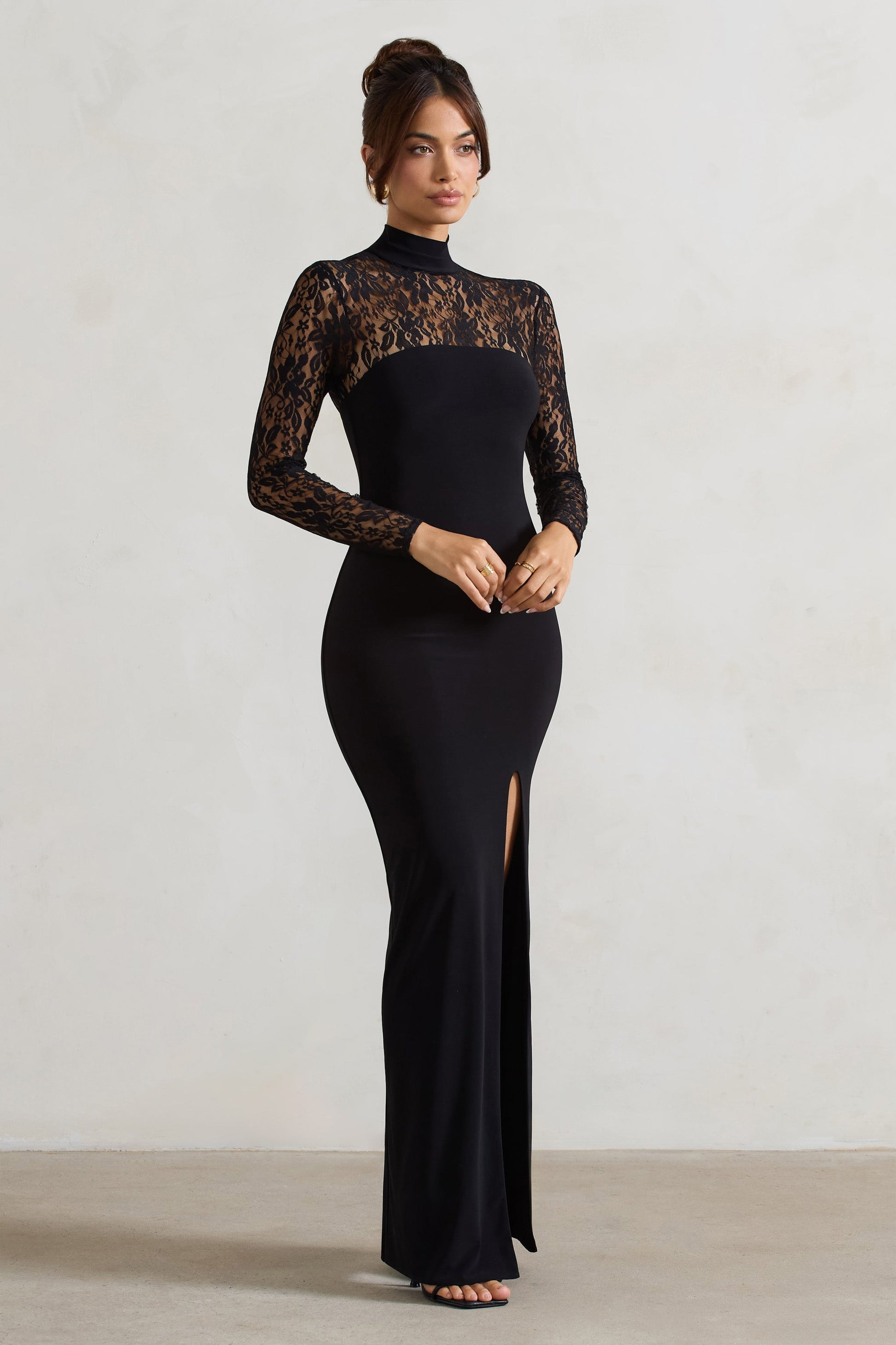Arden | Black High-Neck Split Maxi Dress With Lace Sleeves