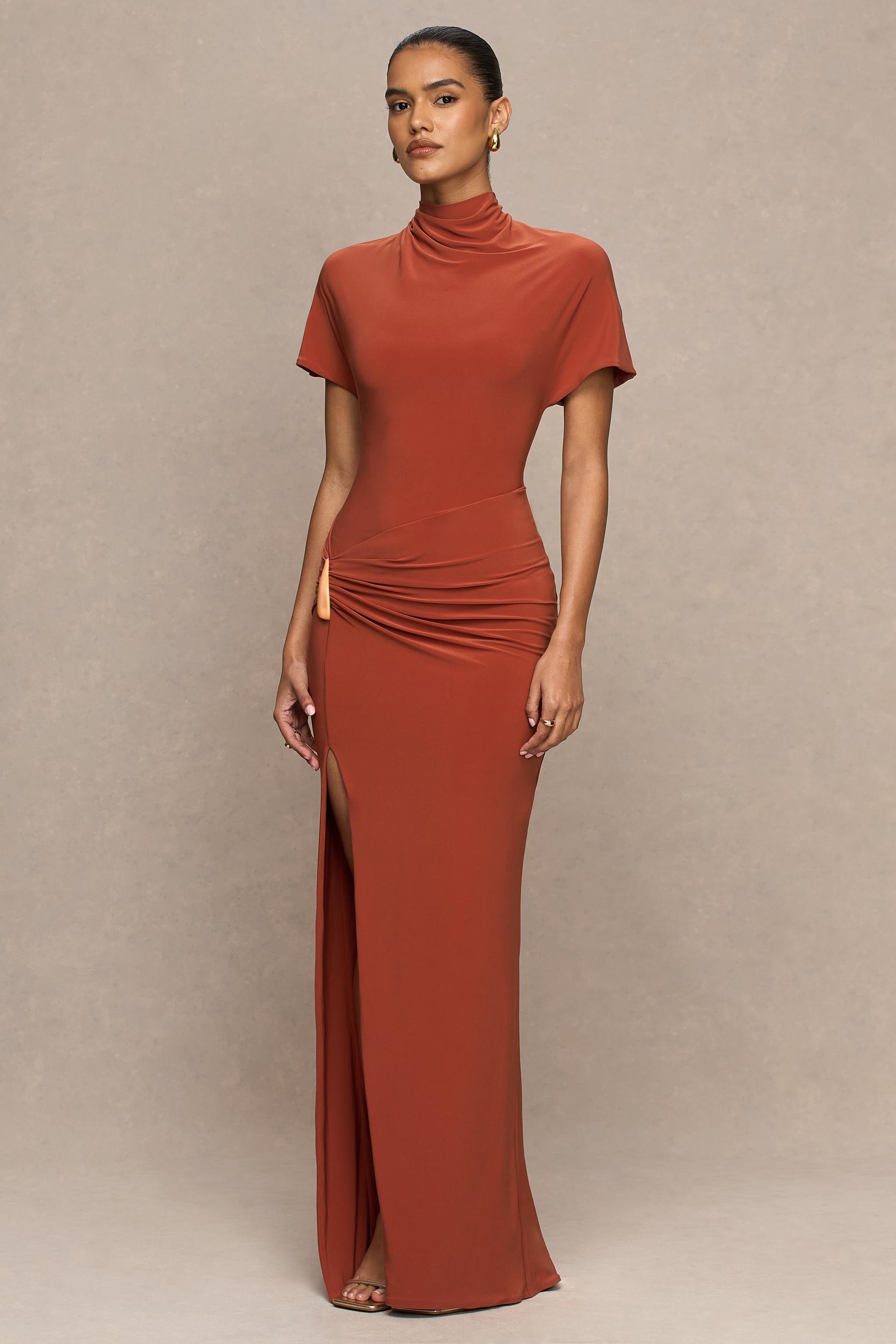 Fierce, refined, and unforgettable, Arlena is your ultimate statement-maker. Designed in our premium red stretch jersey, this maxi dress sculpts the body with effortless ease while offering comfort and movement. The high neckline and gathered wrap detail create a sophisticated silhouette, accented by a touch of gold hardware at the waist for a chic finish. A daring front-high split adds drama, balancing elegance with allure. Arlena is a show-stopping piece made for evenings that demand confidence and glamour.