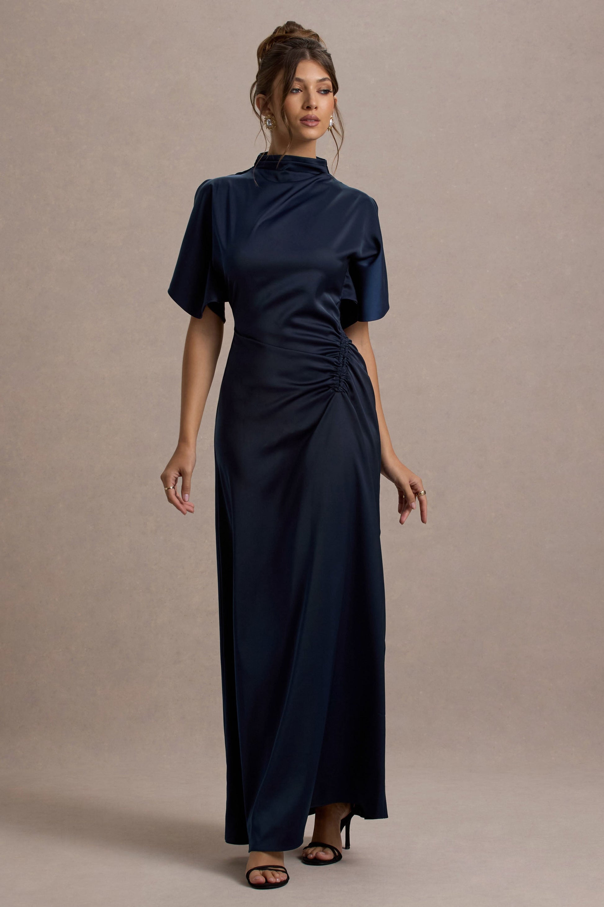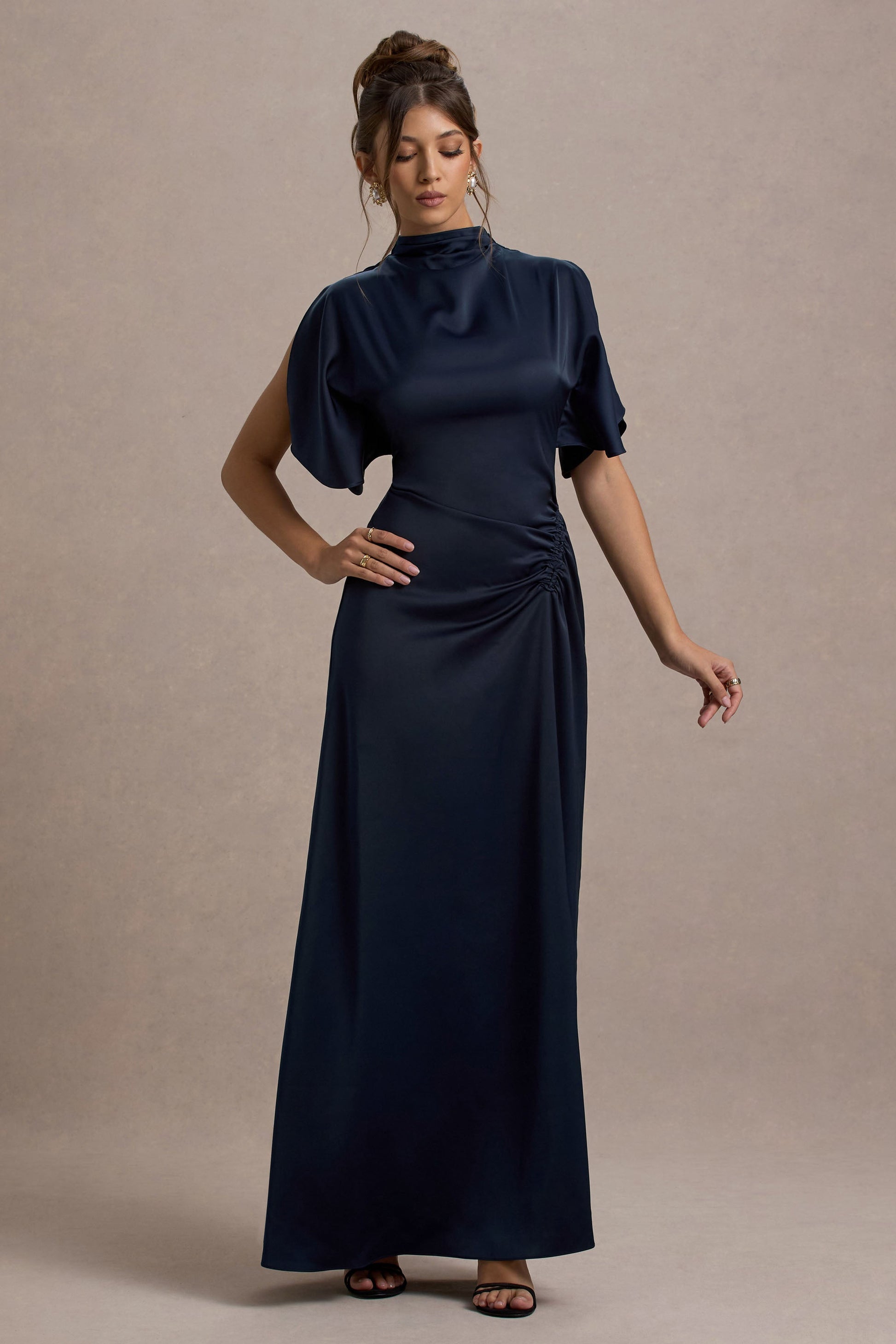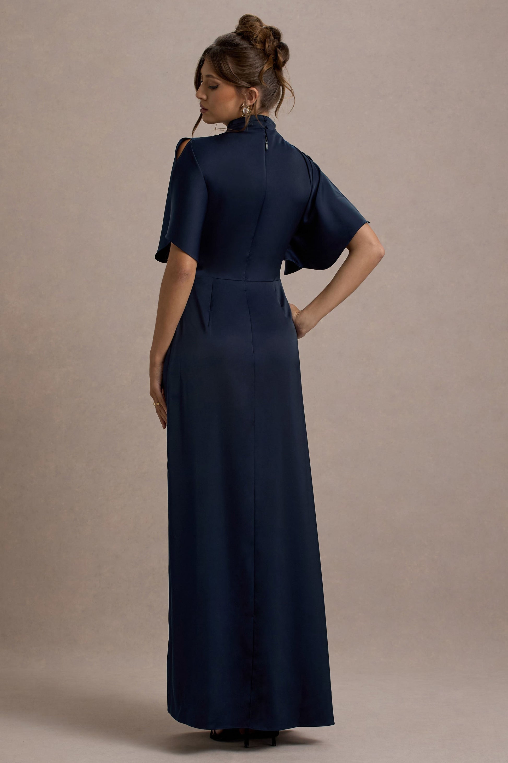 Audley | Navy Satin High-Neck Flutter-Sleeve Maxi Dress