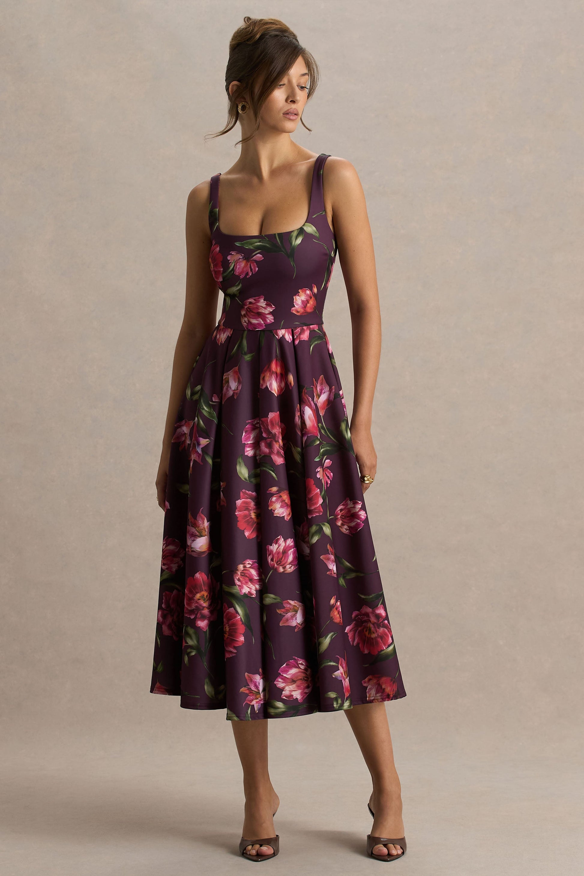 Berta | Burgundy Floral Print Square-Neck Midi Dress