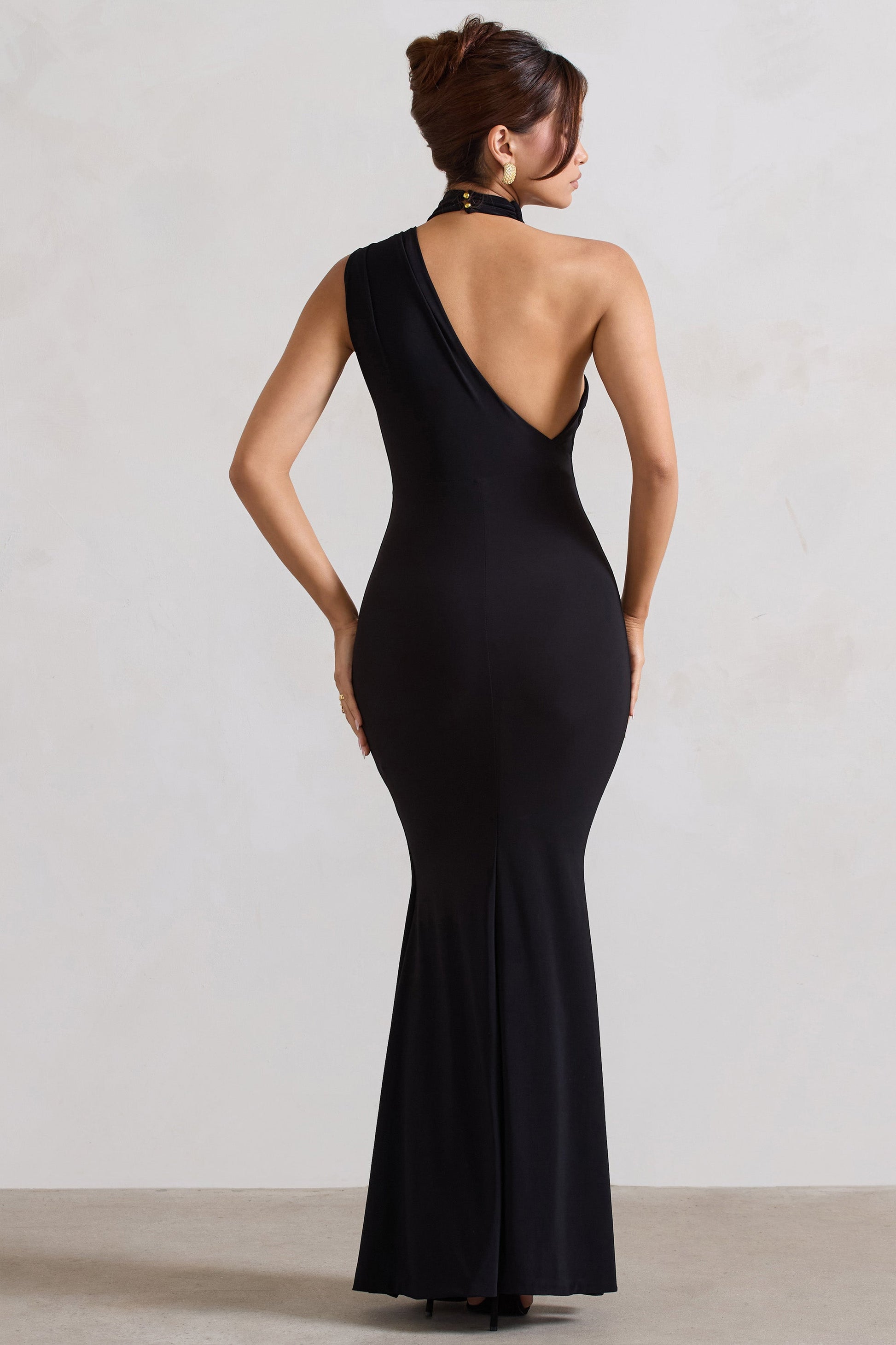 Frame your decolletage as well as your figure in our latest draped maxi dress, Capucine. Designed in house from luxurious black jersey, this eye-catcher features an asymmetric bodice with a high halter neck and an elegant full-length skirt. Showcase the striking wrapped silhouette of Capucine with a slicked back bun this wedding season.