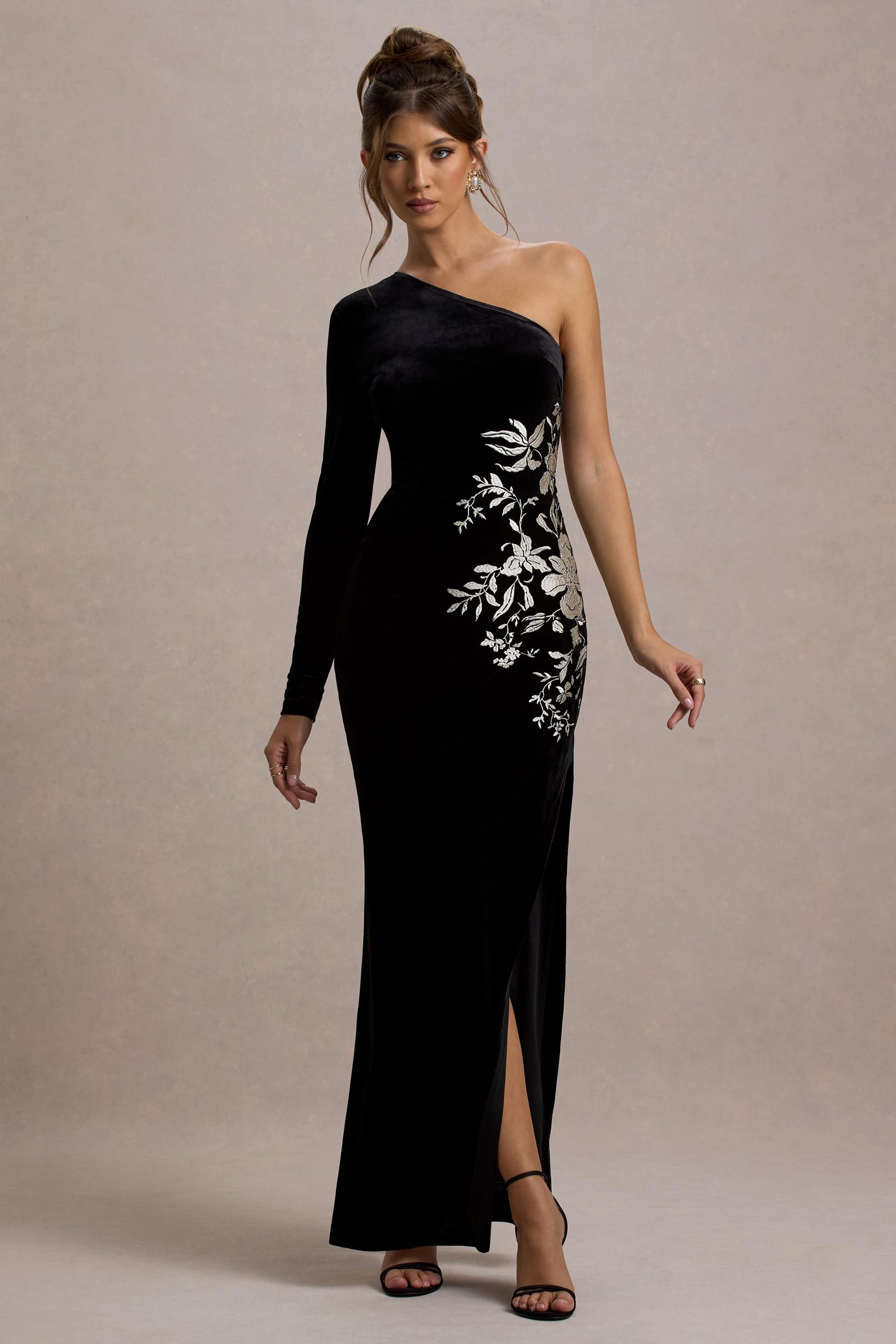 Chance | Black Embroidered Velvet One-Sleeve Maxi Dress
