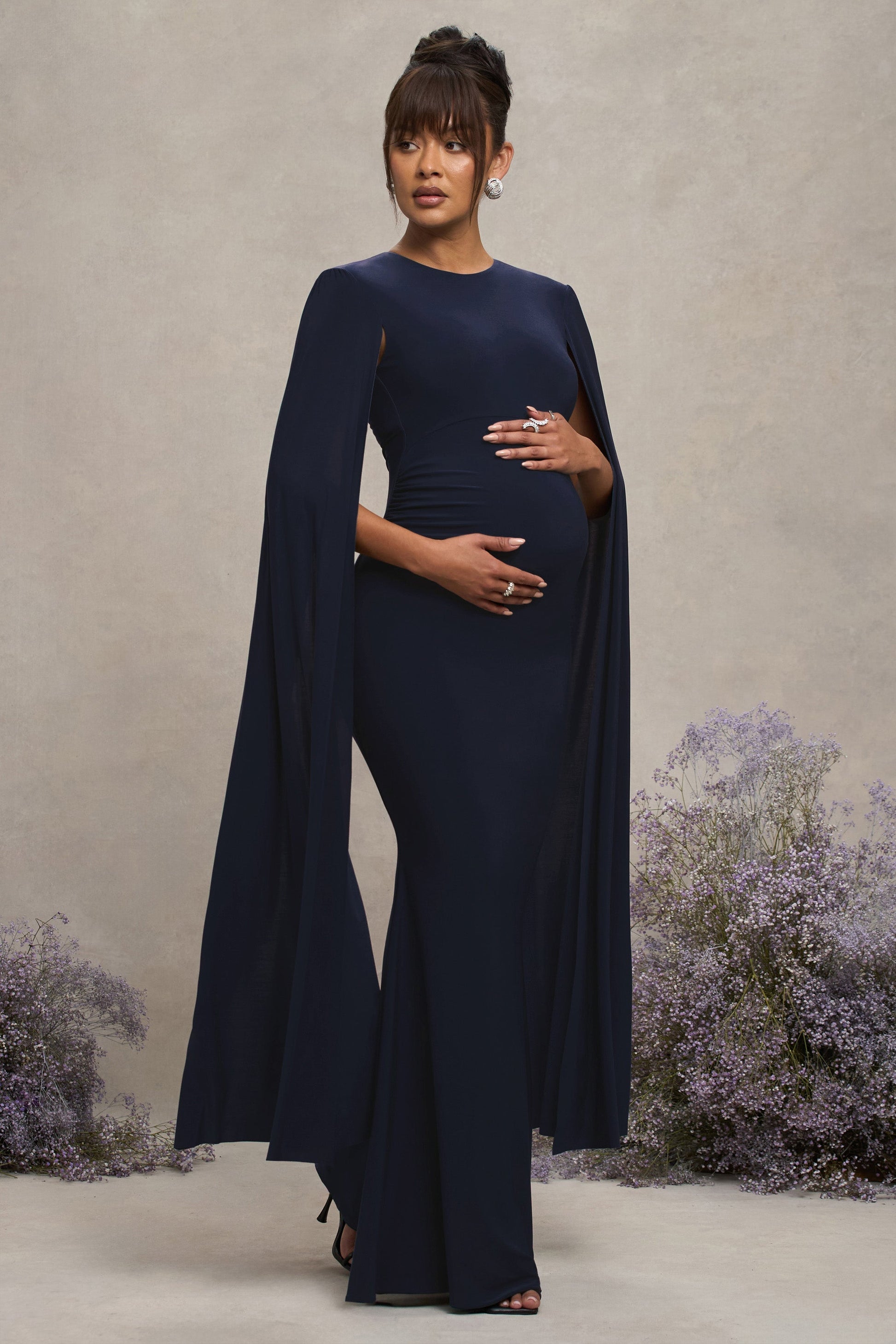 Sculpt your silhouette in our latest maternity design, Divine Timing. Arriving in a rich navy shade, this maxi dress has everything you need to stand out from the crowd at your next black tie event. What defines this opulent piece is its long cape sleeves and floor-sweeping length. For the perfect wedding guest ensemble, try styling Divine Timing with a sleek bun and some statement earrings.