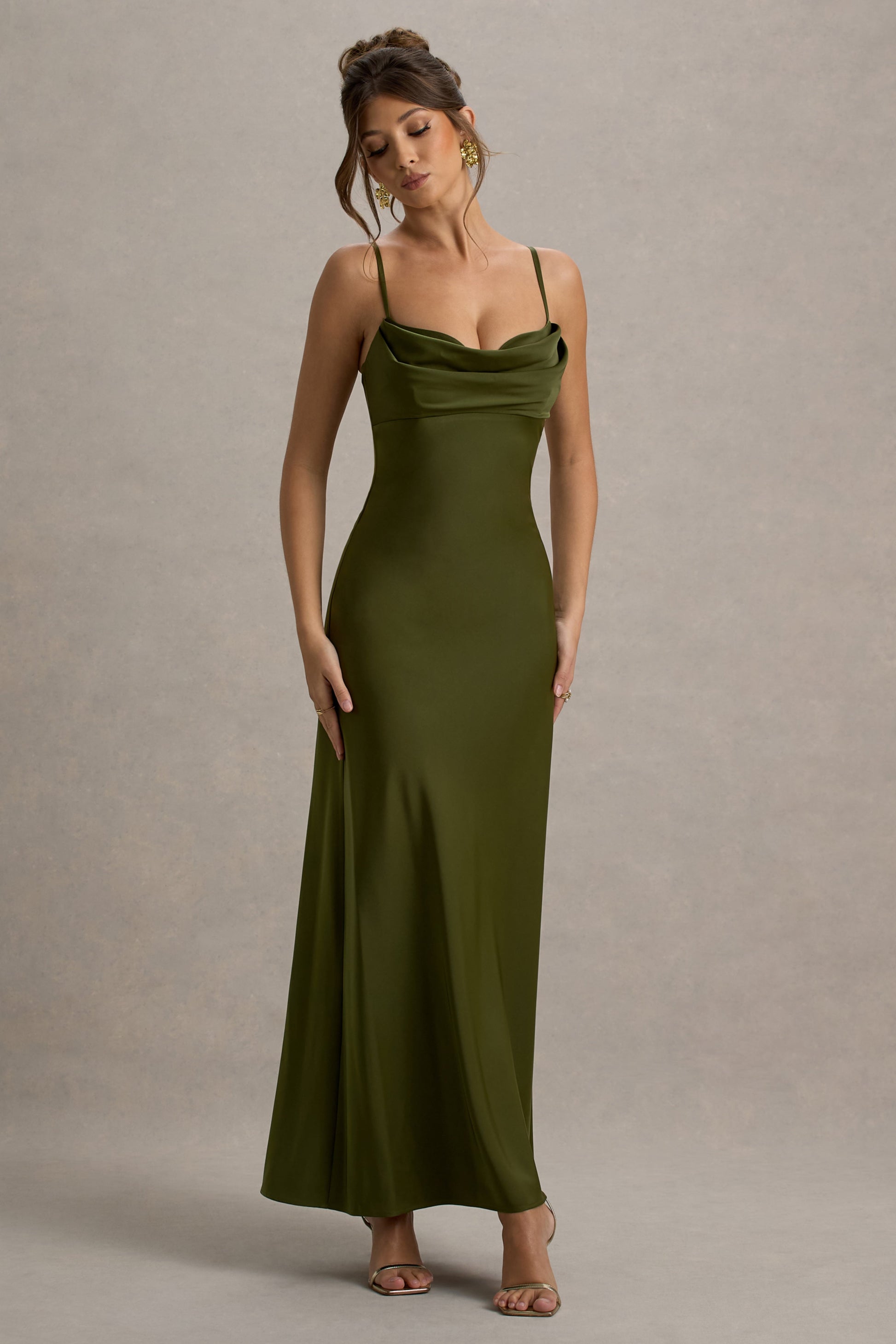 Eimear is a striking blend of sophistication and glamour. Crafted in our premium satin in a stunning olive green shade, this piece showcases a flattering sweetheart neckline which cascades in a flattering silhouette. Perfect for weddings or proms, style yours with classic stilettos to make a statement.