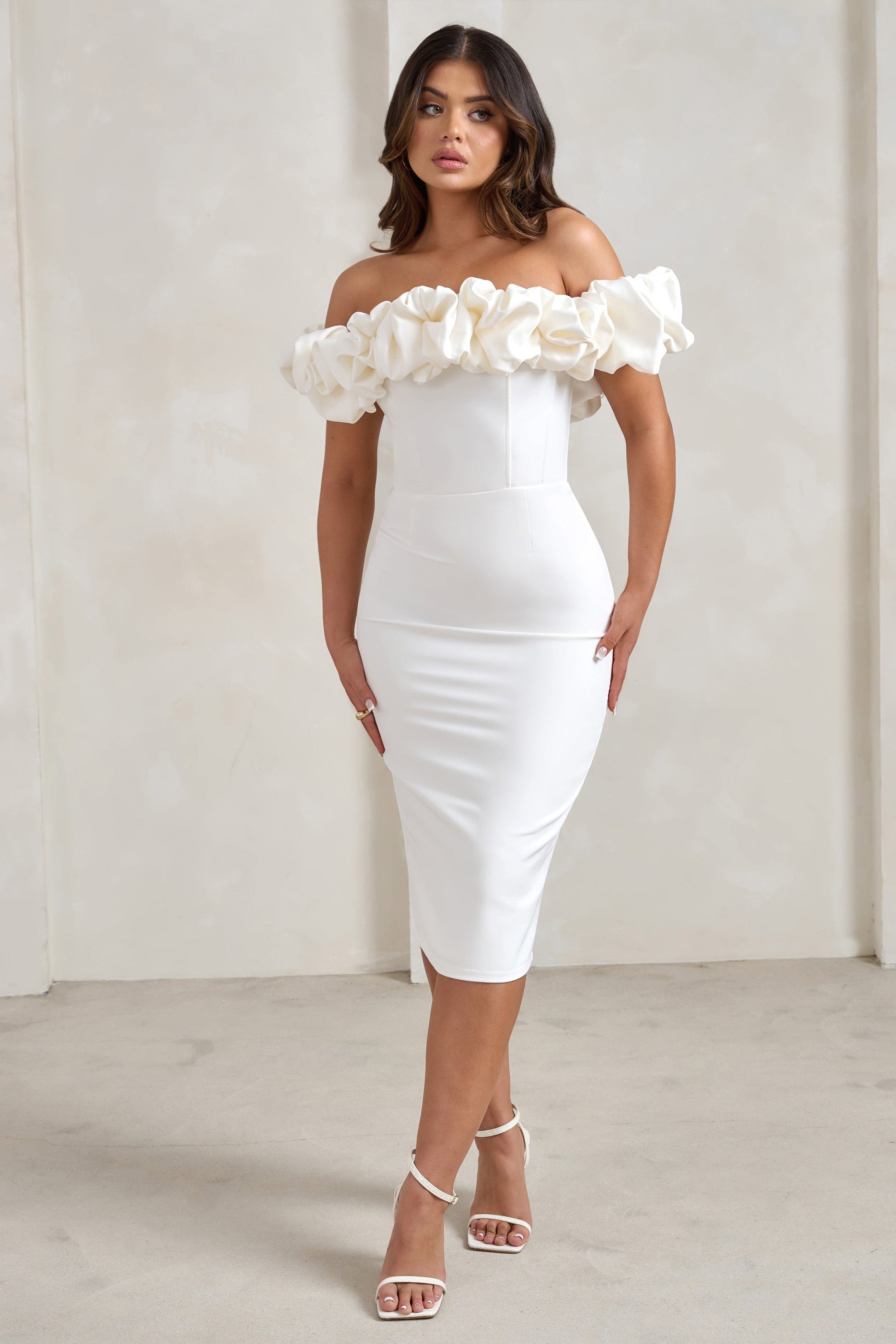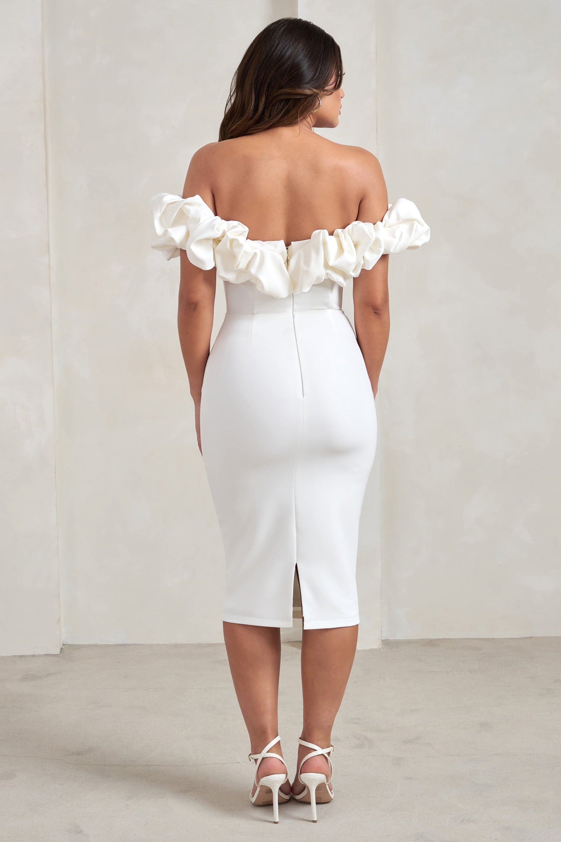 Make an elegant entrance at that upcoming wedding in our eye-catching Estie midi dress. Crafted from a white crepe that's both luxurious and sculpting, this bodycon dress boasts a statement Bardot neckline with a voluminous puff trim that wraps into draped sleeves. Complement Estie's classic design with diamond earrings and strappy silver heels.