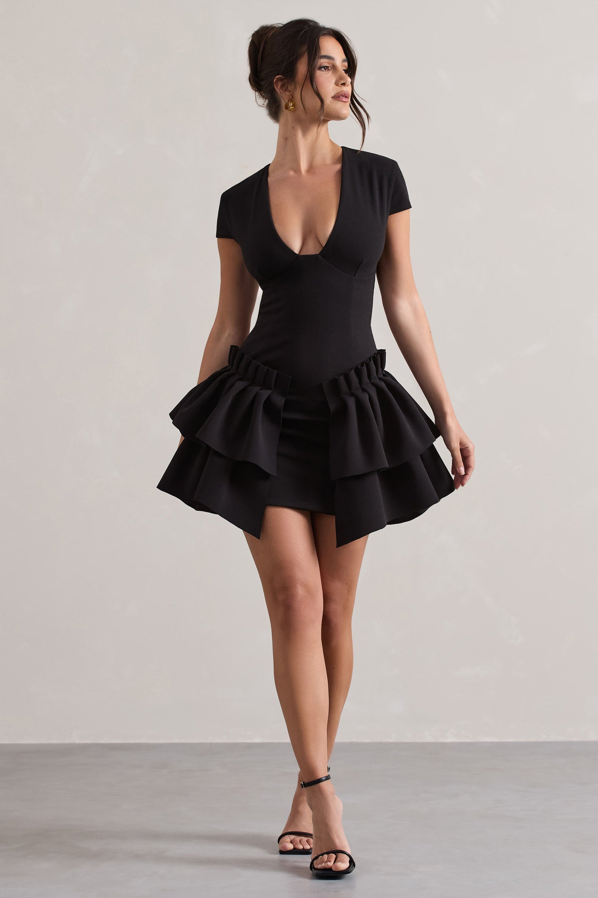 Genevieve | Black Plunge-Neck Mini Dress With Layered Hem