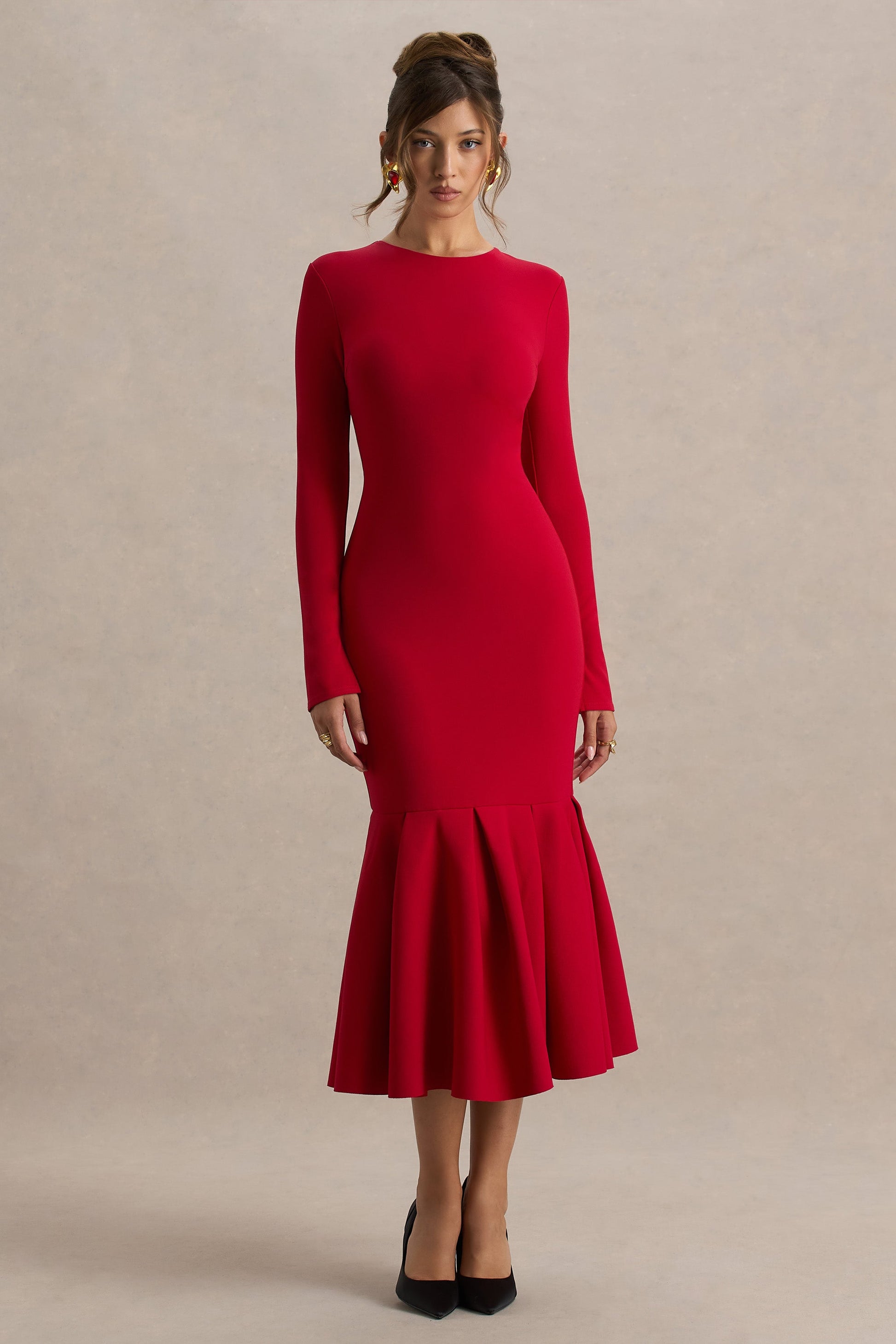 Liberty | Red High Neck Mermaid Maxi Dress With Ruffling Detail