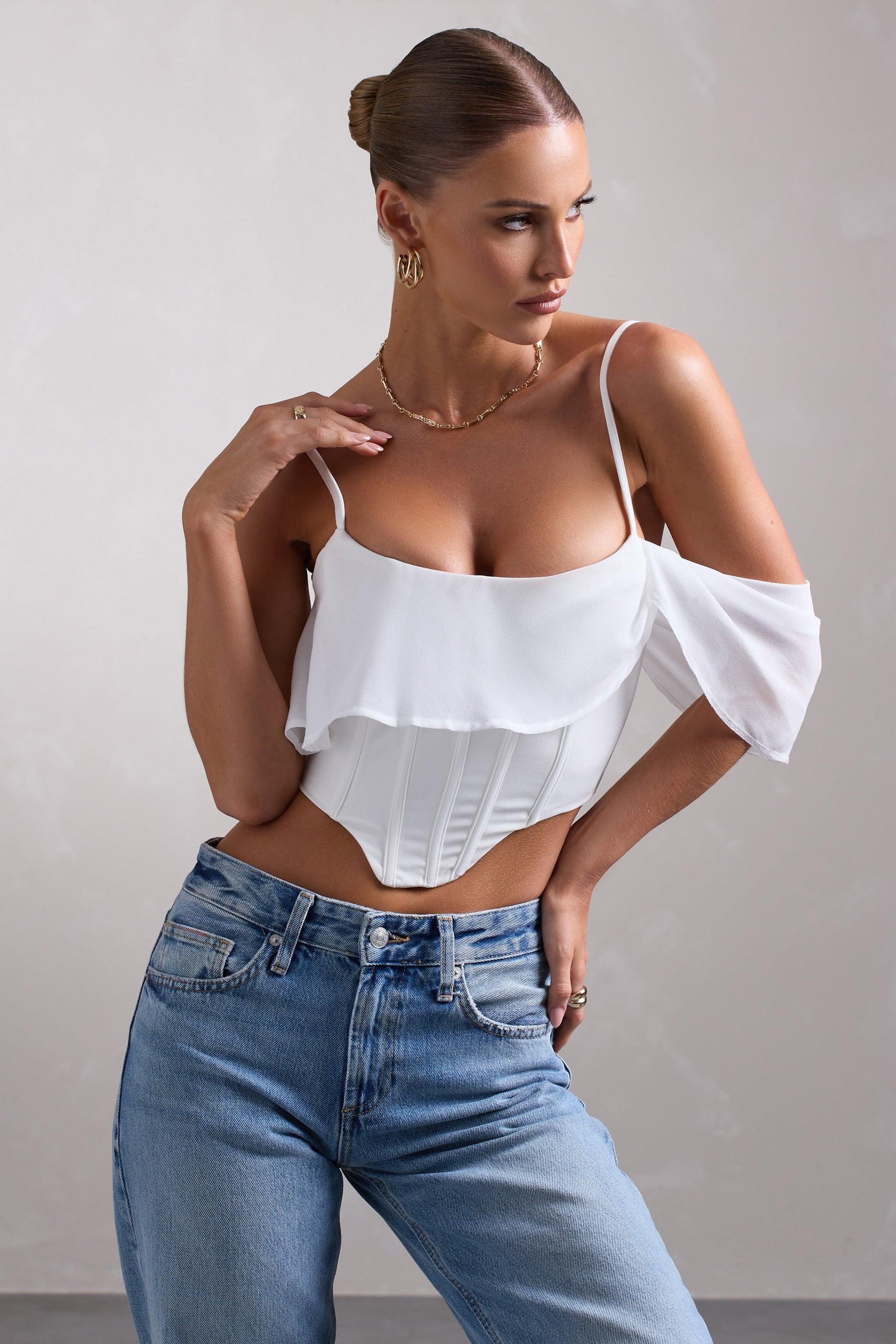 Lost In Your Love | White Asymmetric Corset Top With Draped Chiffon Sleeve