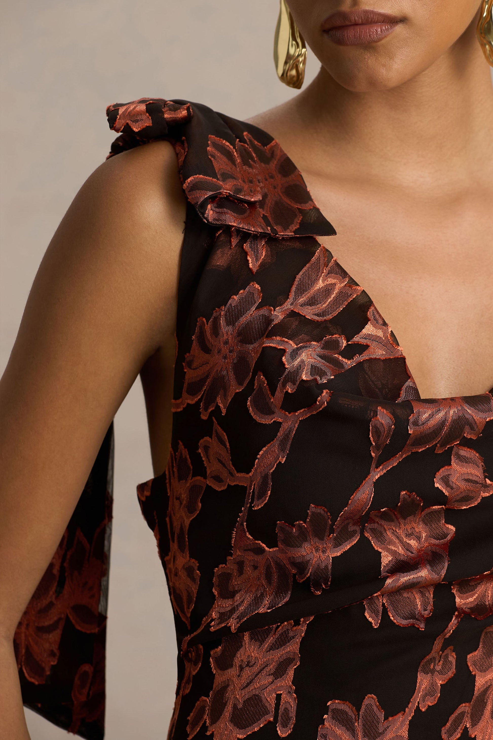 Turn every moment into a statement with Mar, a striking design made to captivate. Crafted from our premium devore in a rich combination of black and rust, it's the head turner you need this season. Mar showcases an asymmetric neckline with a delicate adjustable cami strap and a dramatic bow sleeve for a touch of elegance. A true showstopper for evenings that call for unforgettable glamour.