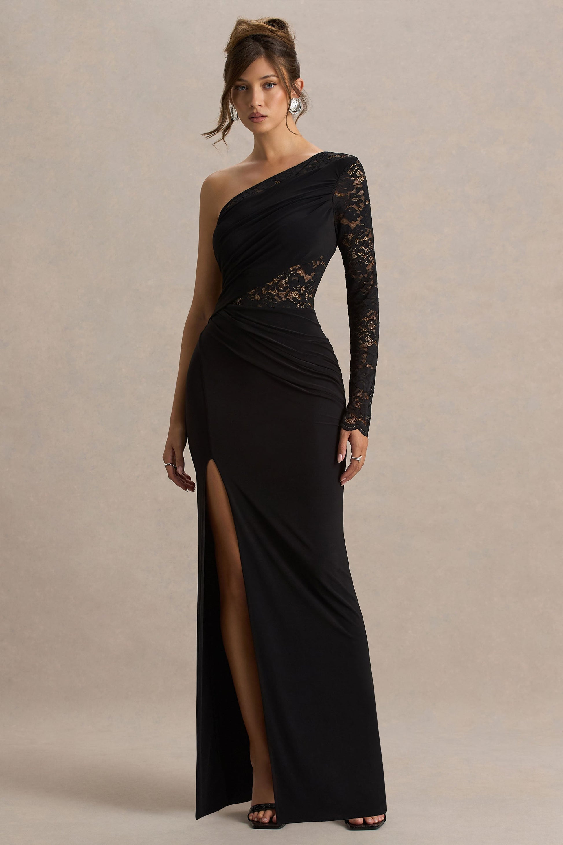 Melody | Black Asymmetric-Neck Maxi Dress With Lace Detailing And Front-High Split