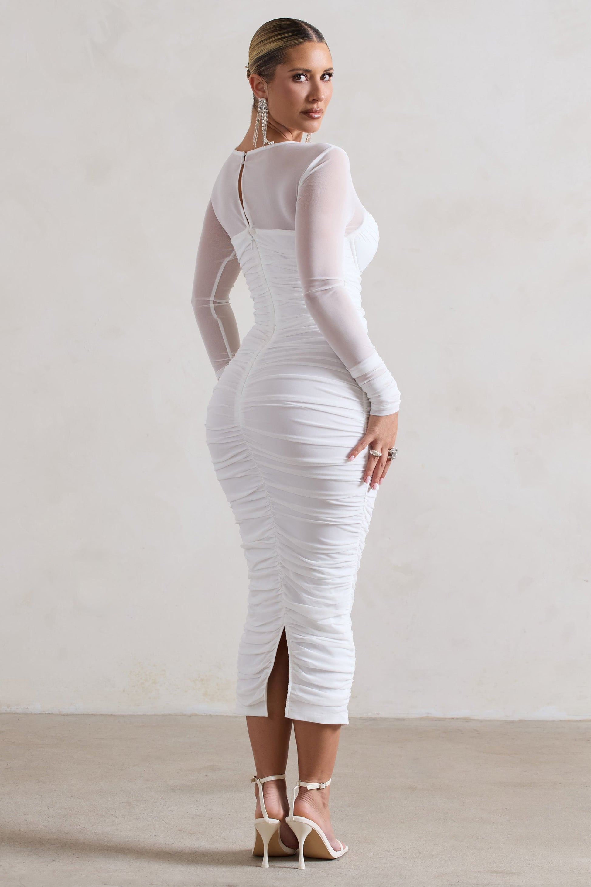 Mojito | White Ruched Cut-Out Long-Sleeve Midi Dress