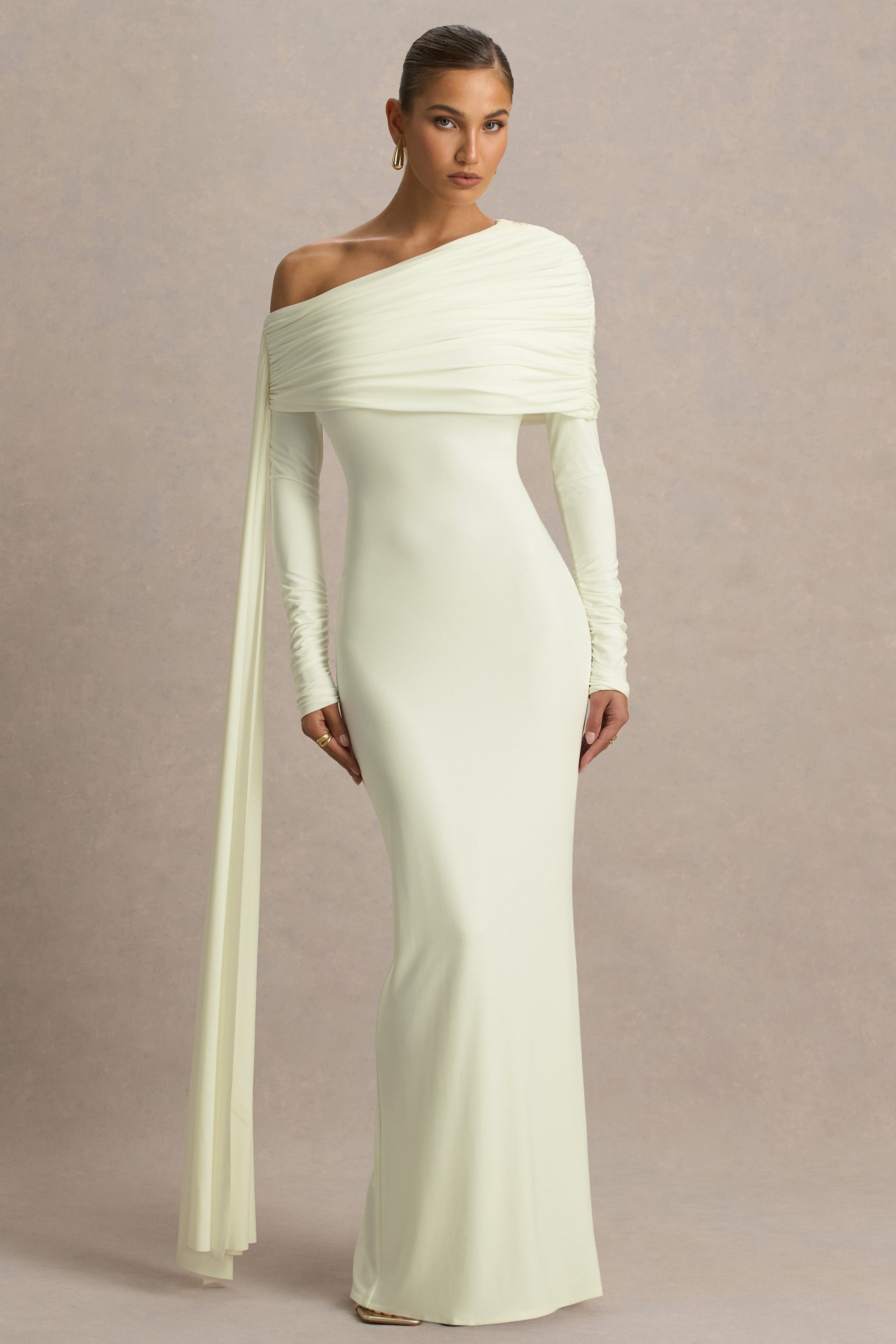 Graceful, glamorous, and undeniably captivating, Octavia is made for the spotlight. Cut from our premium stretch jersey in a soft cream hue, this maxi dress this gown is an embodiment of elevated eveningwear. A romantic bardot neckline highlights the decolletage, balanced by long sleeves for a sleek silhouette. Finished with ruched detailing sculpts the body, while a fluid sash falls from the waist, adding elegant movement with every step. From black tie affairs to elegant dinner parties, in Octavia you will turn heads.