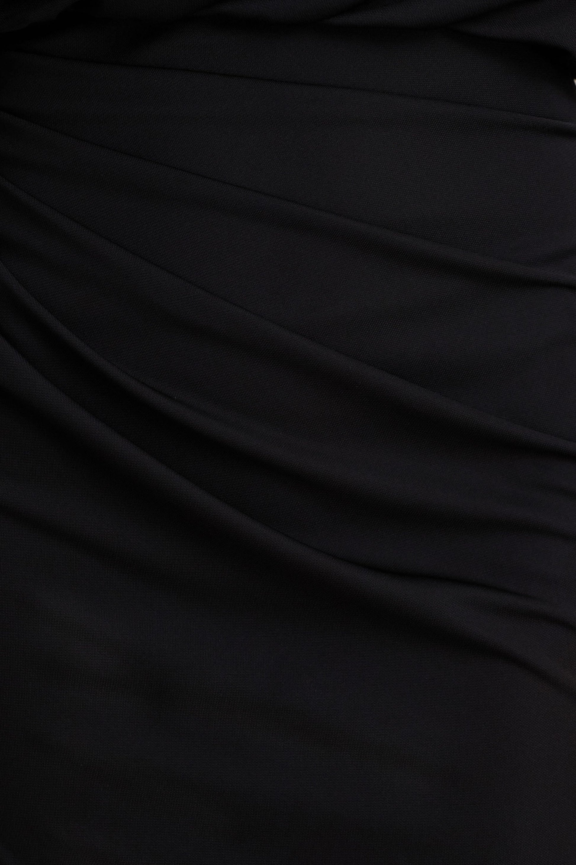 Understated yet unforgettable, Olivia is designed for moments that deserve something extra. Crafted in a soft black hue of our premium stretch jersey and cut to a sweeping asymmetric hemline, this maxi dress brings modern glamour to any occasion. The asymmetric neckline and long sleeves strike a perfect balance of structure and fluidity, while ruched detailing sculpts the silhouette with ease. A wrap-effect and knot detail at the skirt draw the eye and flatter the waist, creating a look that’s polished, poised, and effortlessly refined.
