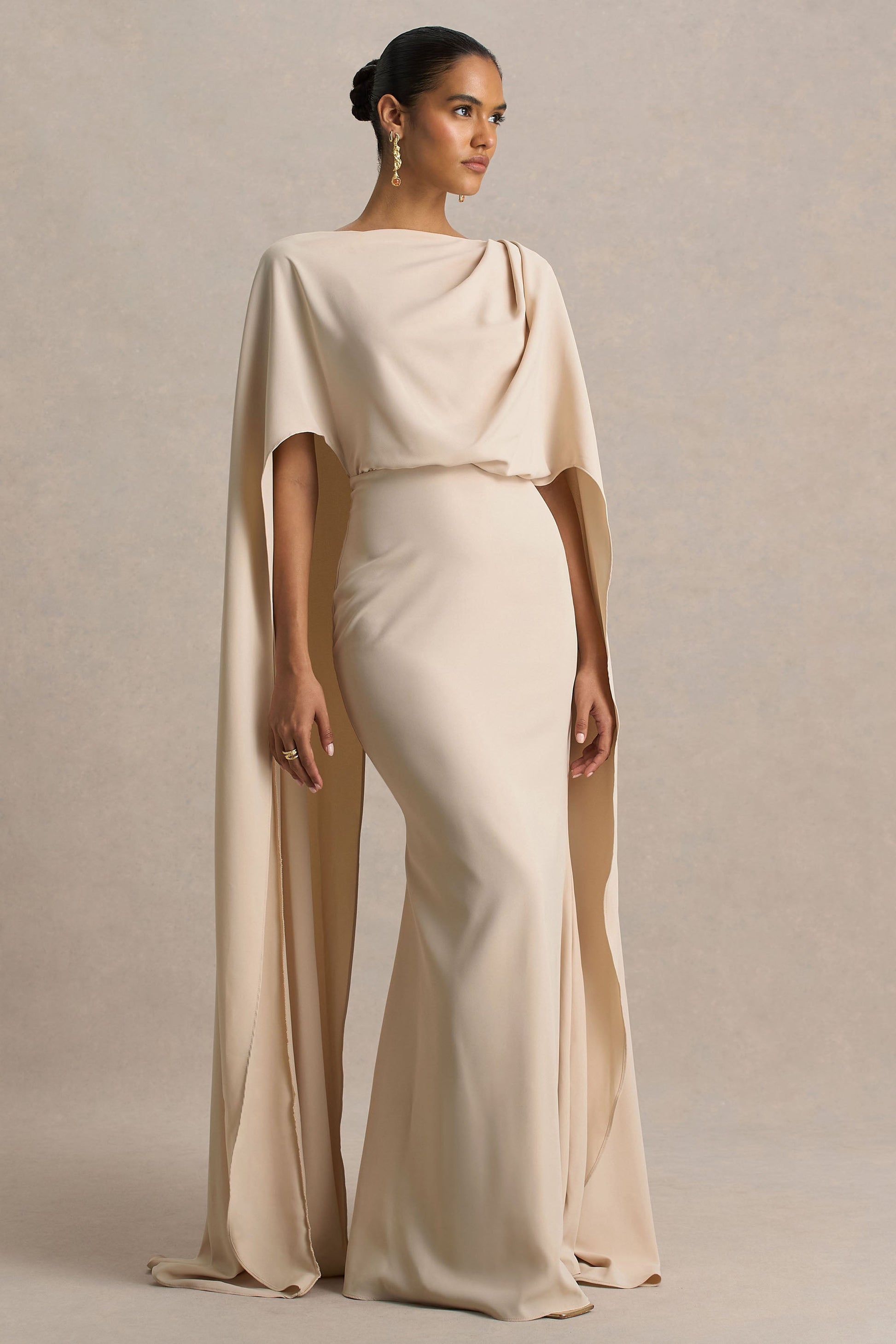 Dramatic elegance meets timeless design in Pristina. Crafted from our premium woven fabric in a rich sand hue, this maxi gown was made to make an entrance. The boat neckline adds a powerful edge, perfectly balanced by a flowing cape detail that sweeps over the shoulders. With a soft blouson bodice and a daring V-shaped back, Pristina is the definition of effortless glamour. Style with sleek heels and a glamorous clutch bag for the perfect, sophisticated evening ensemble.