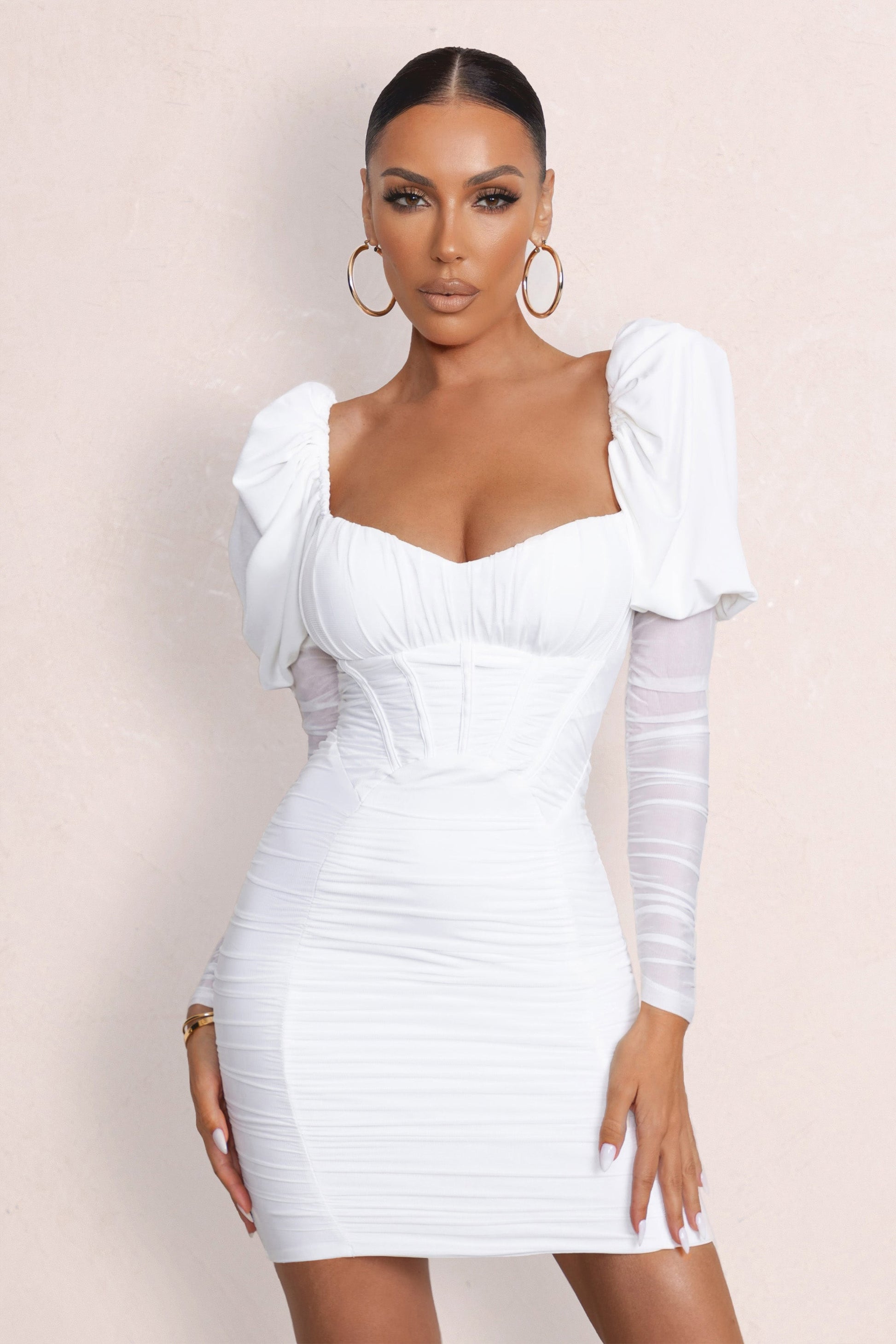 Reminiscent | White Puff Sleeved Ruched Mini Dress