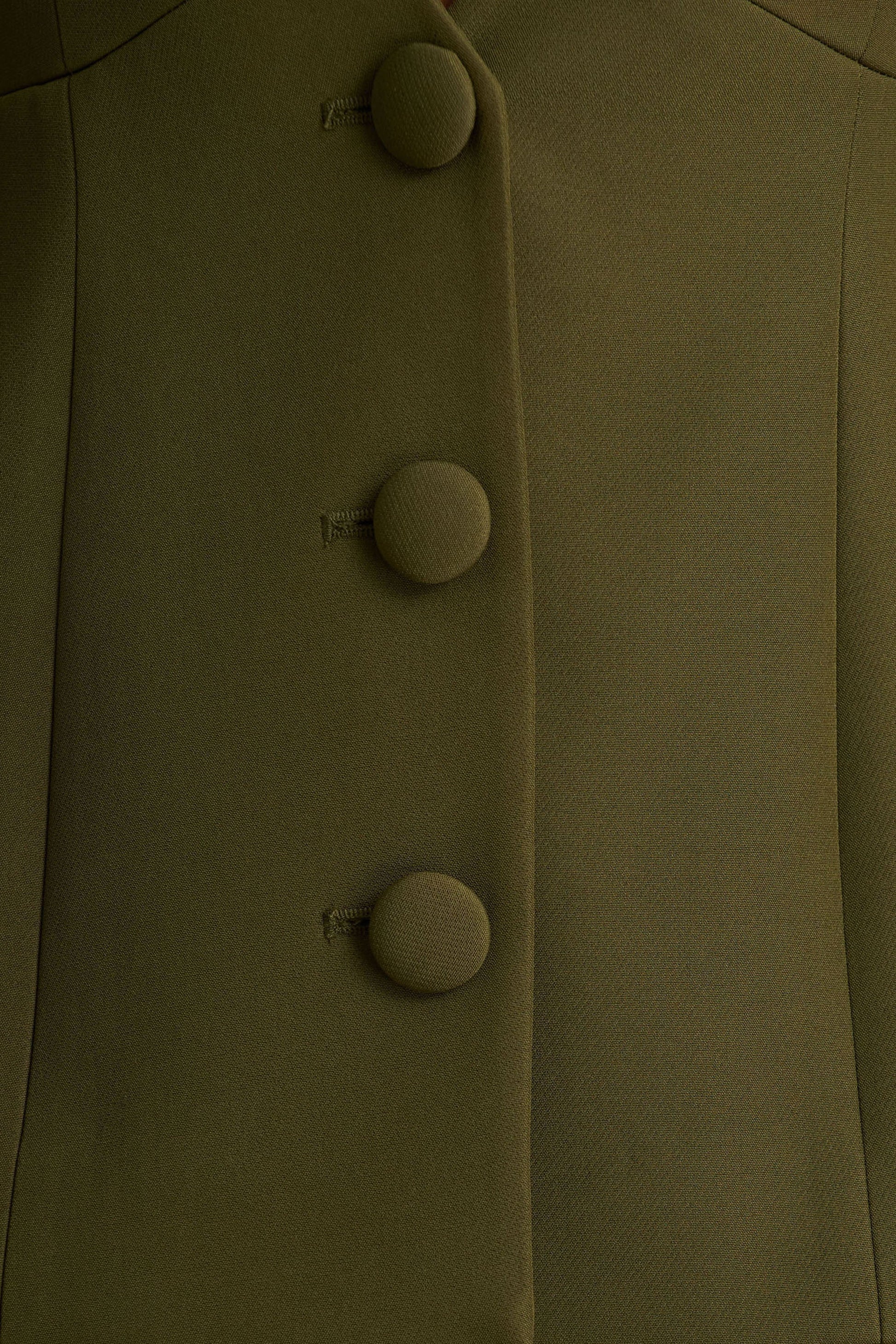 Introducing Rosalina, a power-piece that embodies sharp tailoring and feminine allure. Cut from our premium stretch crepe in a timeless olive hue, this statement blazer effortlessly balances structure with sophistication. Designed with a daring plunge neckline and elevated by strong shoulder pads, it commands attention with every wear. Finished with a sleek button closure for a polished touch, Rosalina is the ultimate layering piece for evenings that call for power and poise.