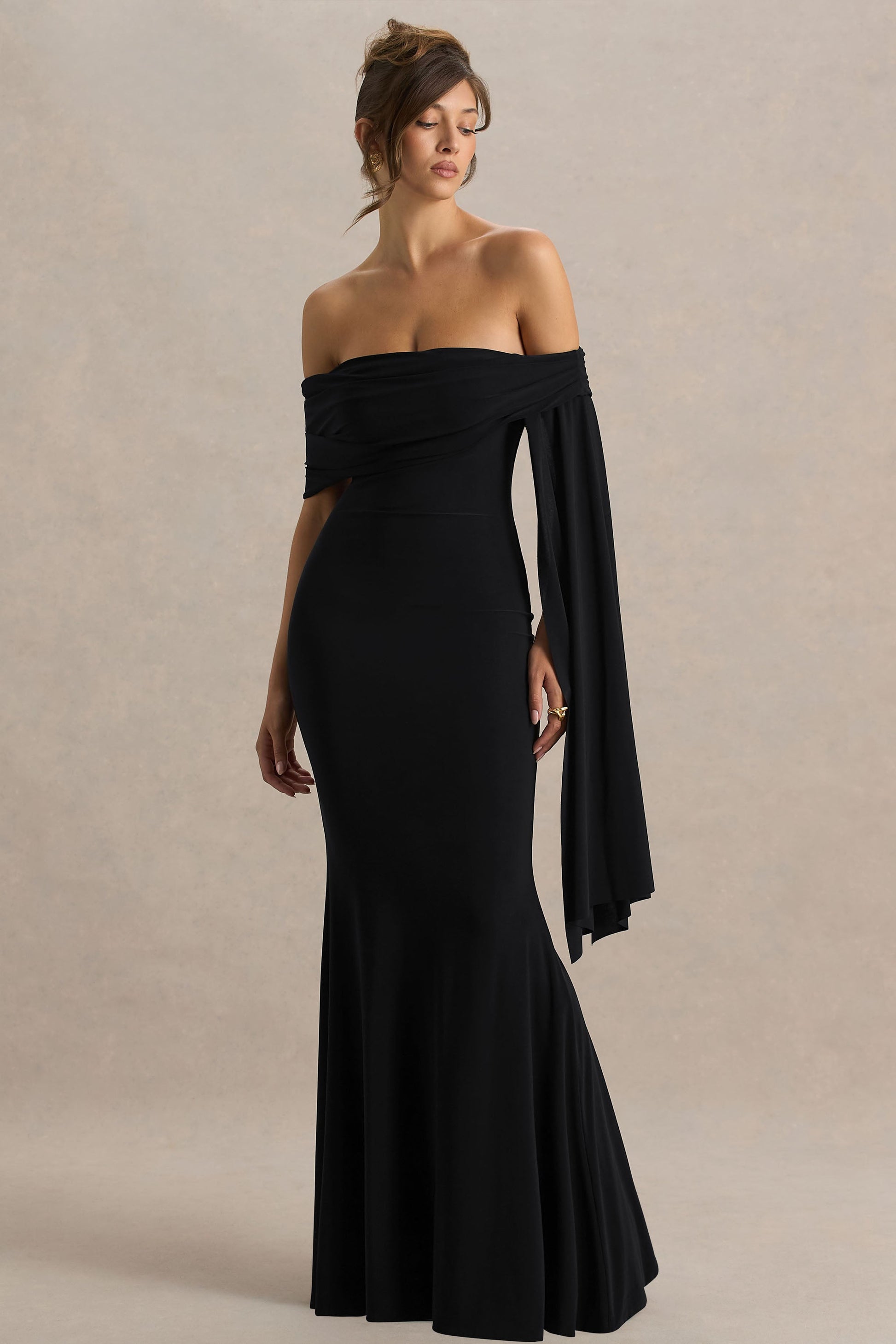 Saffina | Black Bardot-Neck Maxi Dress With Sash Detail