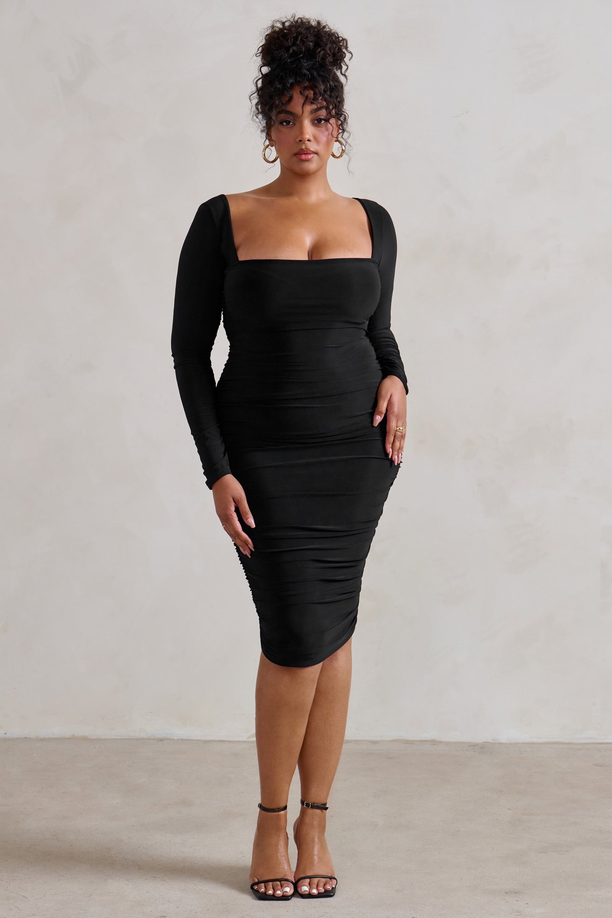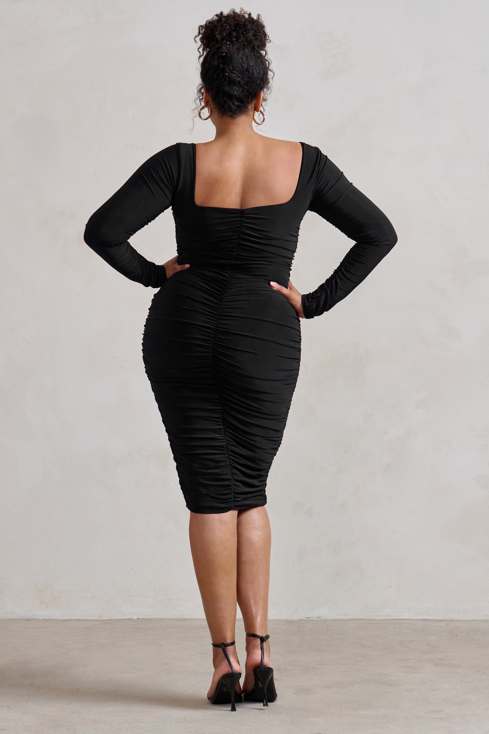 Seductress | Black Long Sleeve Square Neck Ruched Midi Dress