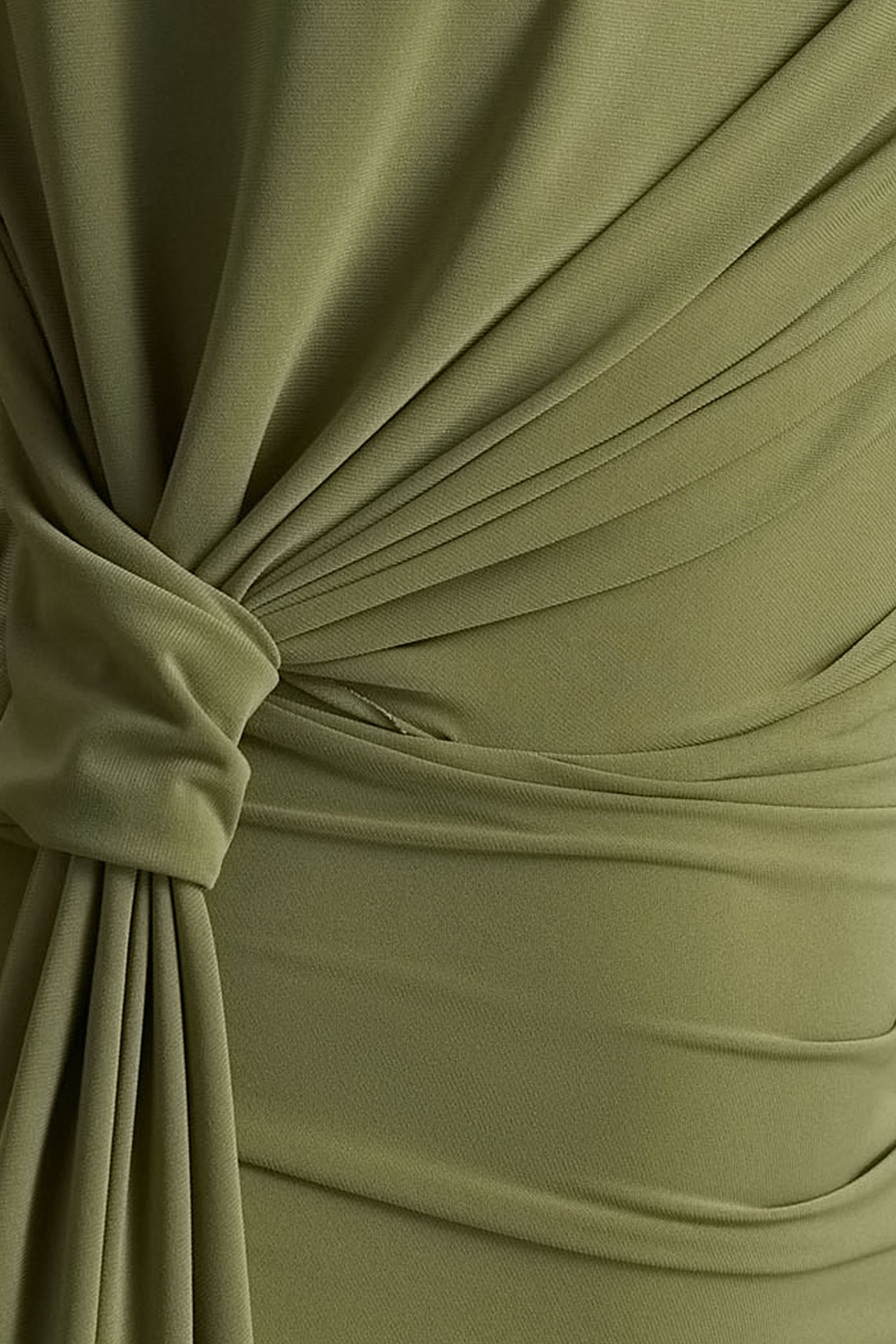 Own the night in Sorenna, a dress that blends sleek sophistication with head-turning detail. Cut from our premium stretch jersey in a classic olive hue, this mini dress contours your curves to perfection. The high neckline offers a refined edge, balanced by the statement knot at the waist that cascades into a dramatic floor-length sash. Ruched detailing enhances the silhouette, creating a flattering fit that’s made for making an entrance. Sorenna is the definition of chic with a daring twist.