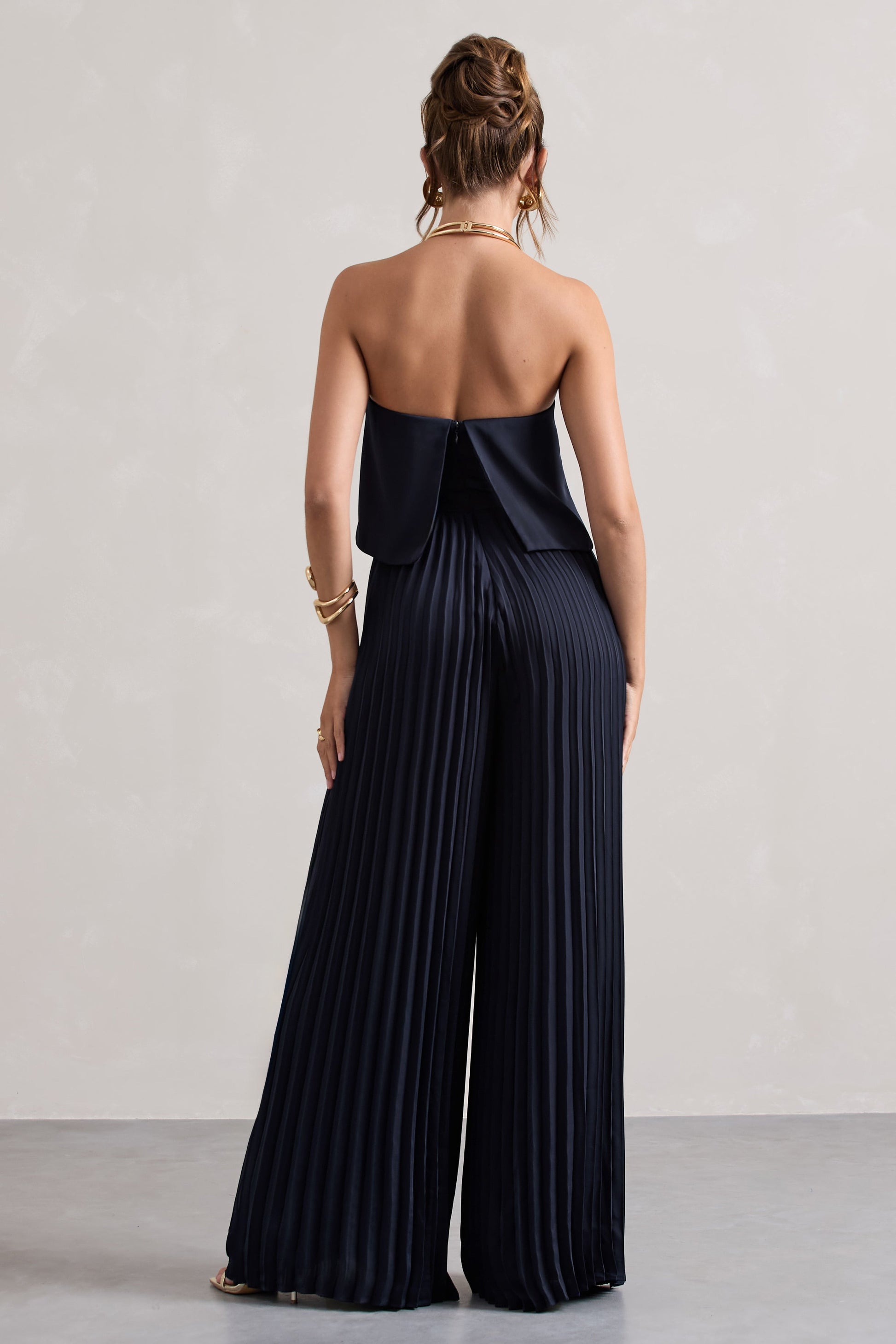 Tammi | Navy Satin Strapless Plisse Wide-Leg Jumpsuit