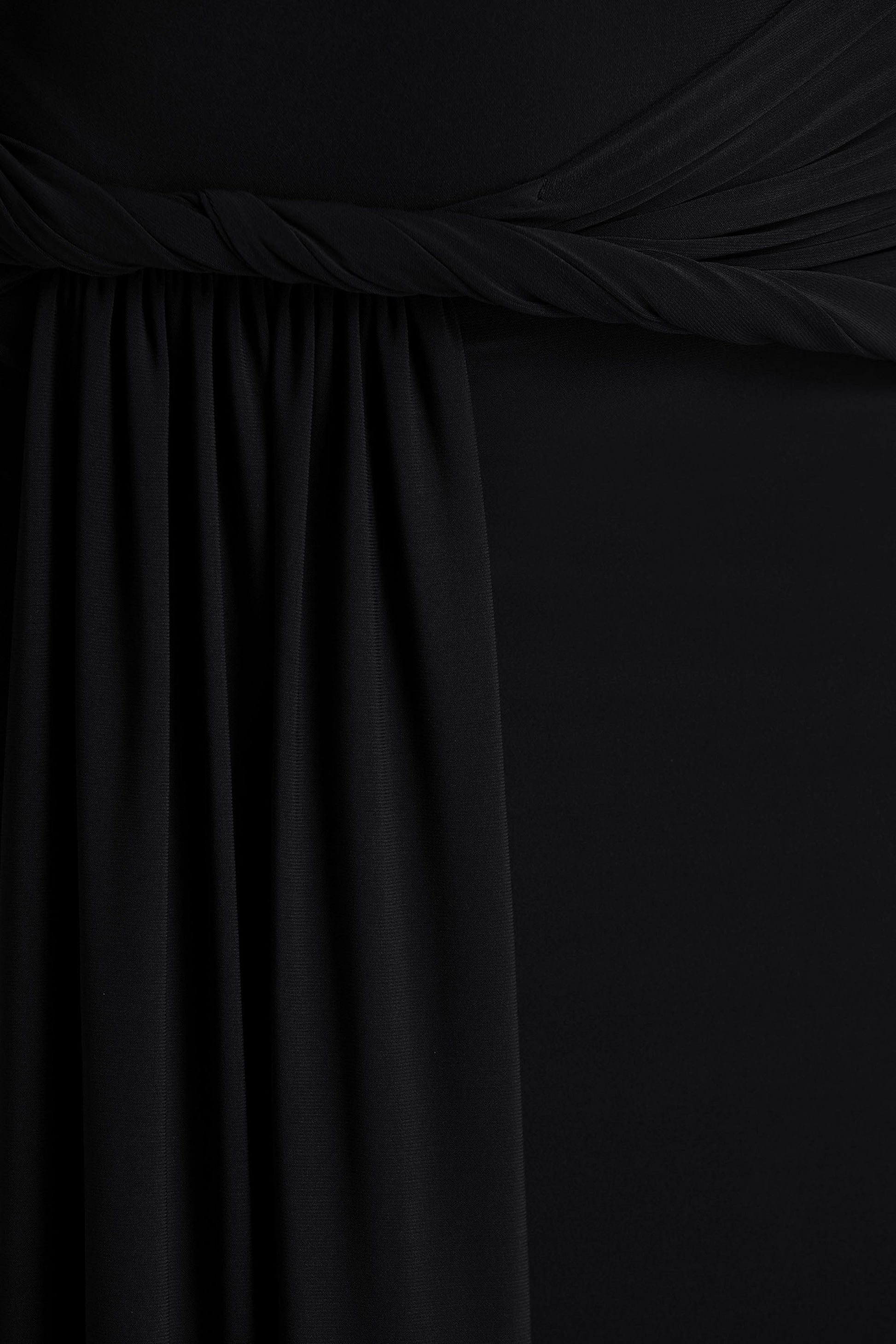 A dress that speaks volumes without saying a word, Tulisa is your invitation to make an unforgettable entrance. Cut in a rich black hue of our premium stretch jersey and cut to a sweeping maxi length, this gown is designed to captivate. The asymmetric neckline and twisted sleeve detail add a modern edge, while ruched accents and a wrap-effect skirt sculpt and flatter the figure. A sash cascades from the waist to hem, bringing movement and fluidity to every step. Chic, confident, and unapologetically bold.