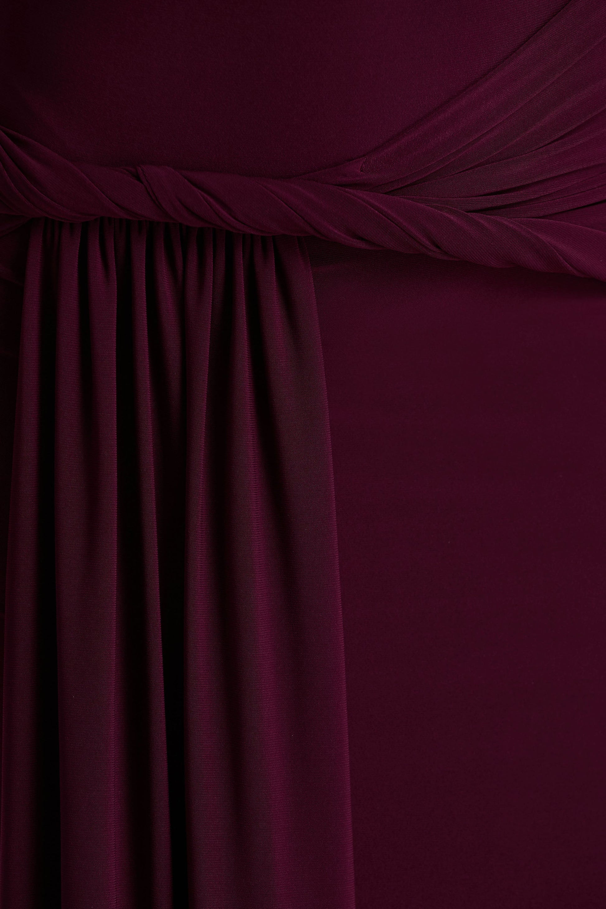 A dress that speaks volumes without saying a word, Tulisa is your invitation to make an unforgettable entrance. Cut in a rich burgundy hue of our premium stretch jersey and cut to a sweeping maxi length, this gown is designed to captivate. The asymmetric neckline and twisted sleeve detail add a modern edge, while ruched accents and a wrap-effect skirt sculpt and flatter the figure. A sash cascades from the waist to hem, bringing movement and fluidity to every step. Chic, confident, and unapologetically bold.