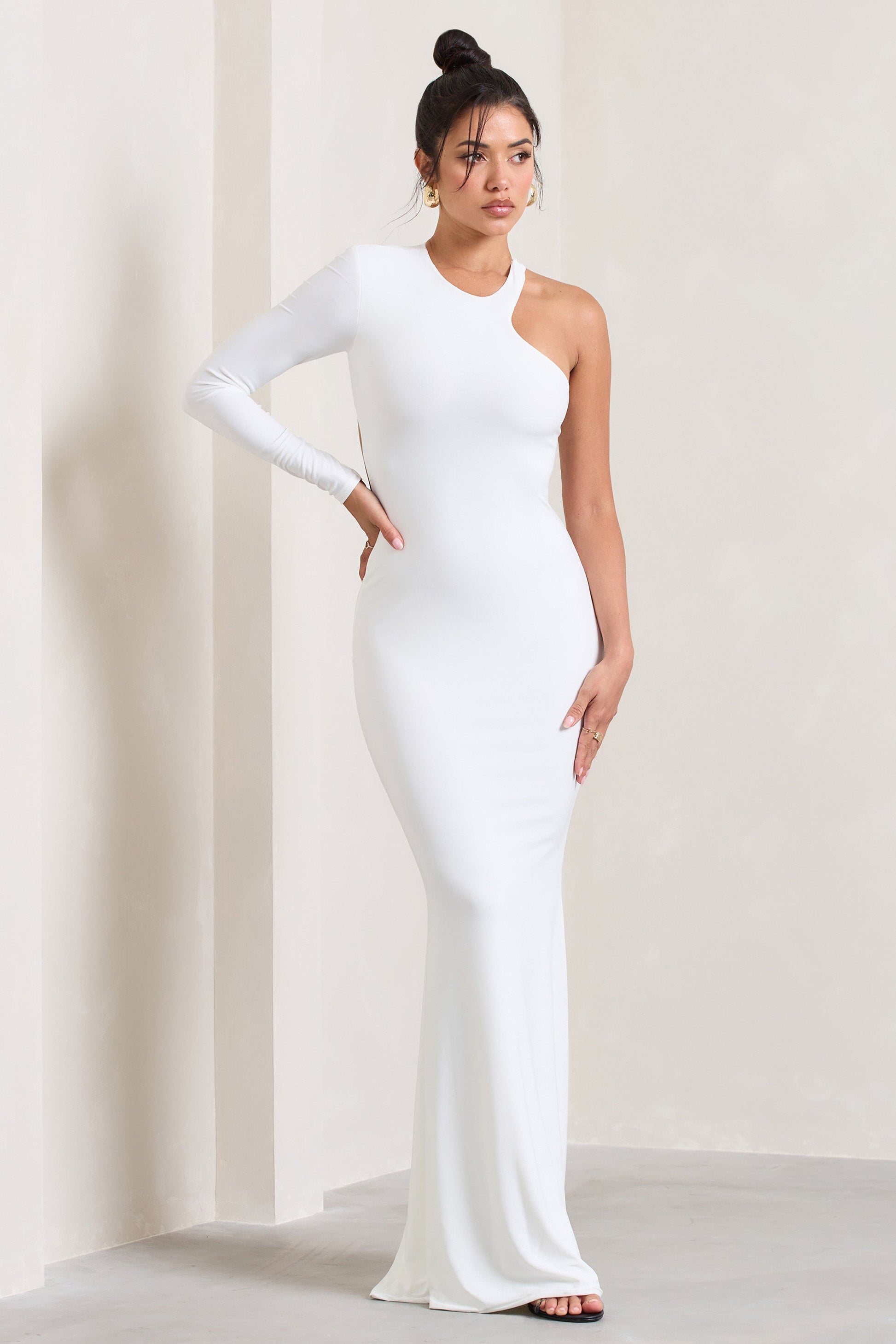 Our Tyra maxi dress boasts a blend of classic and contemporary details that make it as unique as your gorgeous figure. Guaranteed to turn heads at any special occasion, this long white bodycon features an asymmetric neckline with a single long sleeve and a carved out back. Style our Tyra with statement earrings and you'll feel like a true Femme Fatale.