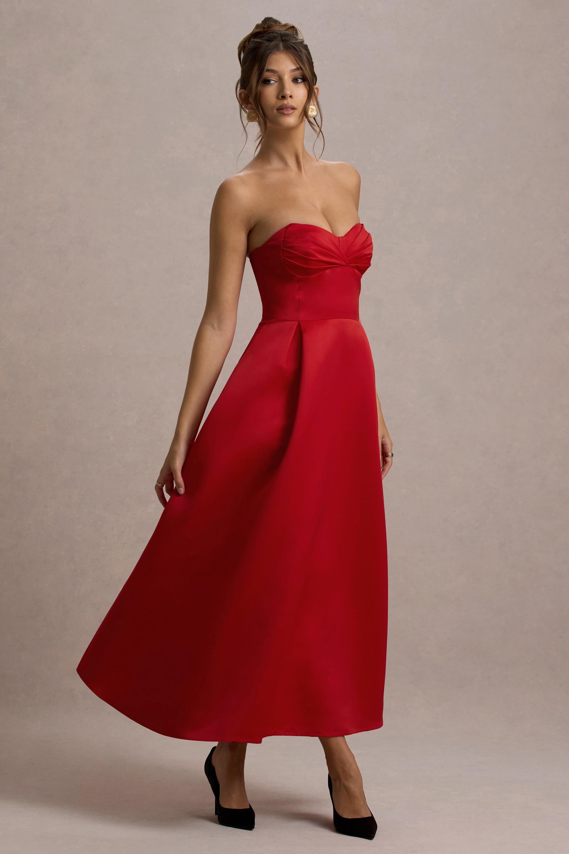Add some feminine flair to your closet this party season with Wintour, our couture-like midi. Designed in a rich red shade of our luxurious satin, this strapless show-stopper boasts a sweetheart neckline, boned corset bodice and fluid pleated skirt.