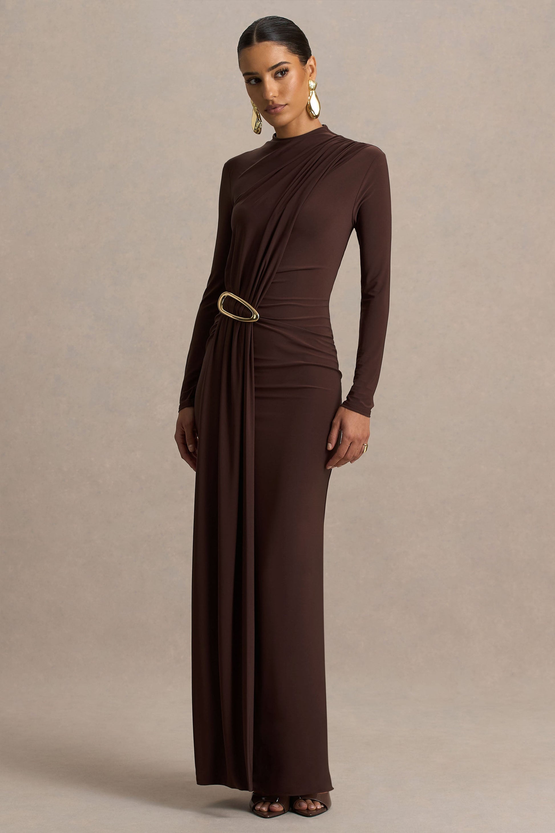 Zadie | Brown High-Neck Maxi Dress With Gathered-Detail